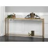 Thick nautical rope is threaded through hand-forged iron rings in this Uttermost Darya Console Table. An aged black finish adds antiqued appeal to this rustic, industrial console table. A clear glass top brings this console table into the modern age.