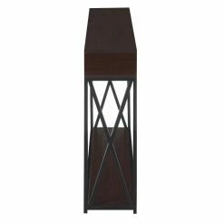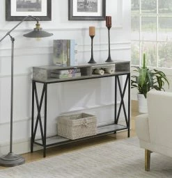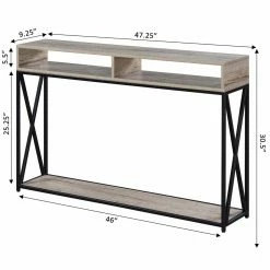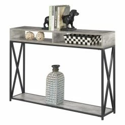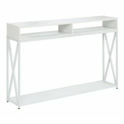 Display your favorite things and keep them neat and tidy all at once with the Convenience Concepts Tucson Deluxe 2 Tier Console Table. Made with a metal base and a solid hardwood tabletop, this console table boasts a slim profile so you can make the most of your space without sacrificing style. Two cubbies and a shelf offer plenty of storage space. Assembly required.