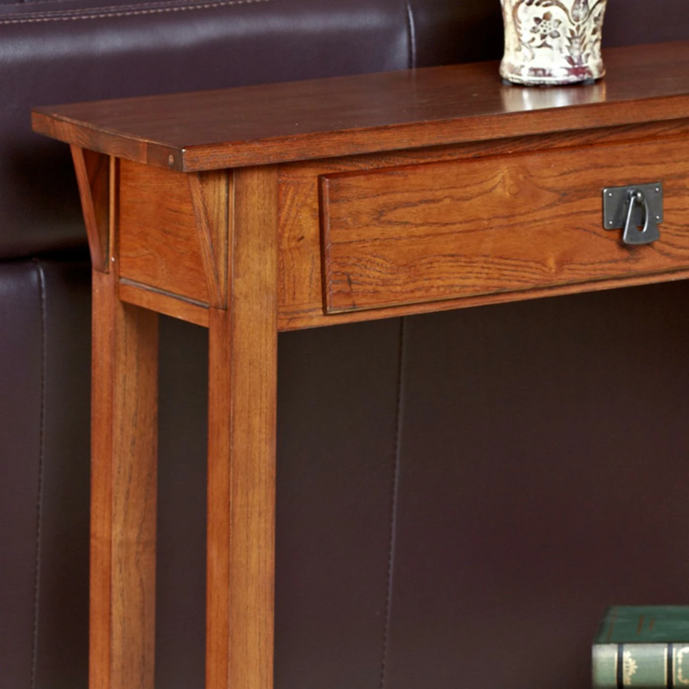 Add a touch of elegance to your home decor-style with the Leick Home 9057-RS Favorite Finds Mission Hall Stand. Featuring a solid ash and oak veneers construction, this Mission-styled stand is sturdy enough to withstand the wear and tear of daily use. The canted post and wedge corbel provide additional stability to this hall stand. Smooth glides make opening and closing of the durable wooden drawer box easy and hassle-free. A rich russet finish and blackened metal hardware add to the visual appeal of the table.