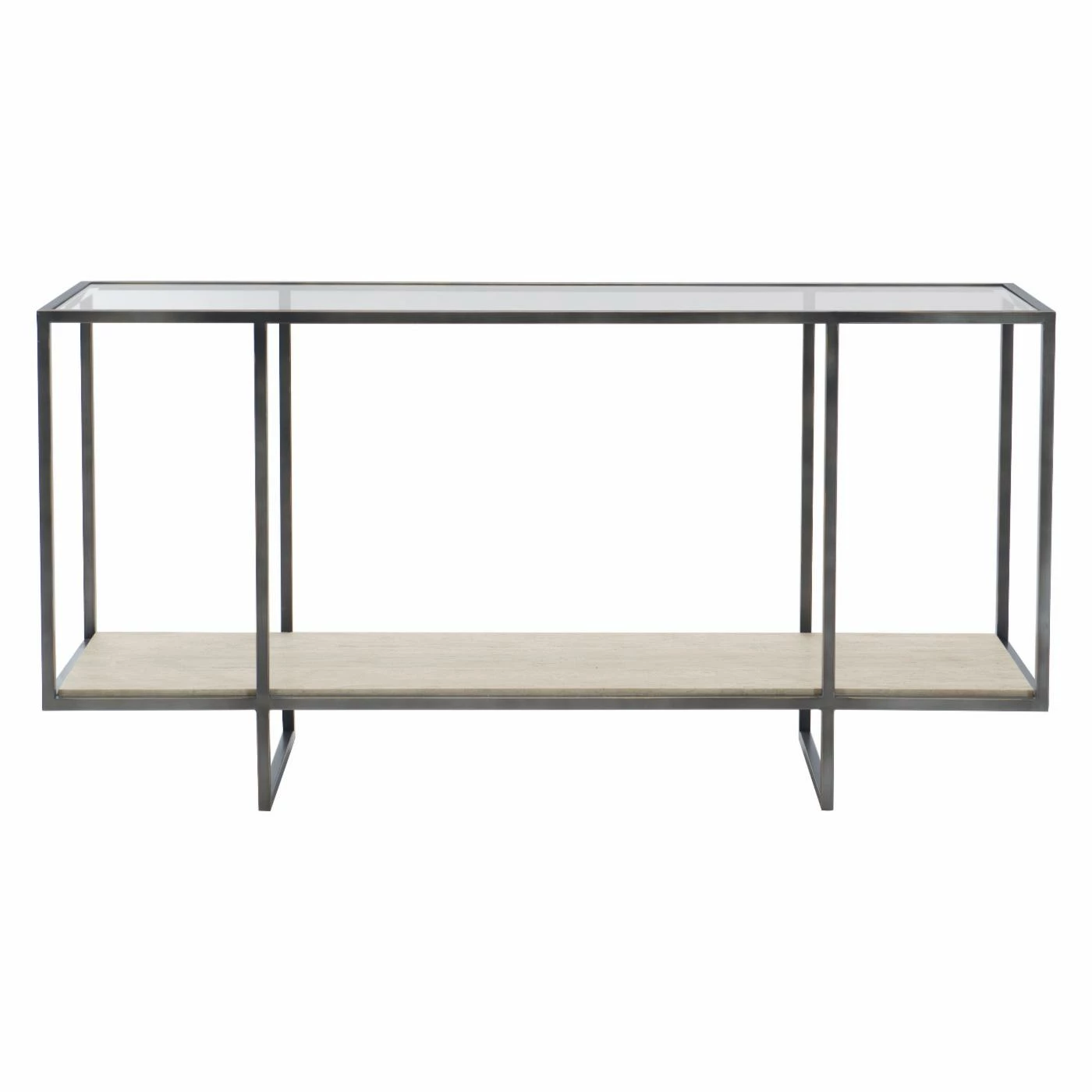 Highlight your favorite photos or collectibles in modern style with the Bernhardt Harlow Metal Console Table, showcased in an elongated, boxy design. This ultra-contemporary console table features a tubular steel frame in an oil-rubbed bronze finish. An inset tempered glass top with beveled edge adds an airy element, while the white travertine stone bottom shelf gives the piece a substantial finishing touch.