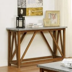 Give your entryway or living room a rustic and industrial air with the Furniture of America Yogur Industrial Sofa Table. Featuring an attractive blending of materials, this sofa table boasts a light gray iron and metal top and a wood and wood veneer frame sporting a versatile natural finish. Its nailhead trim and angled base add the perfect finishing touch.