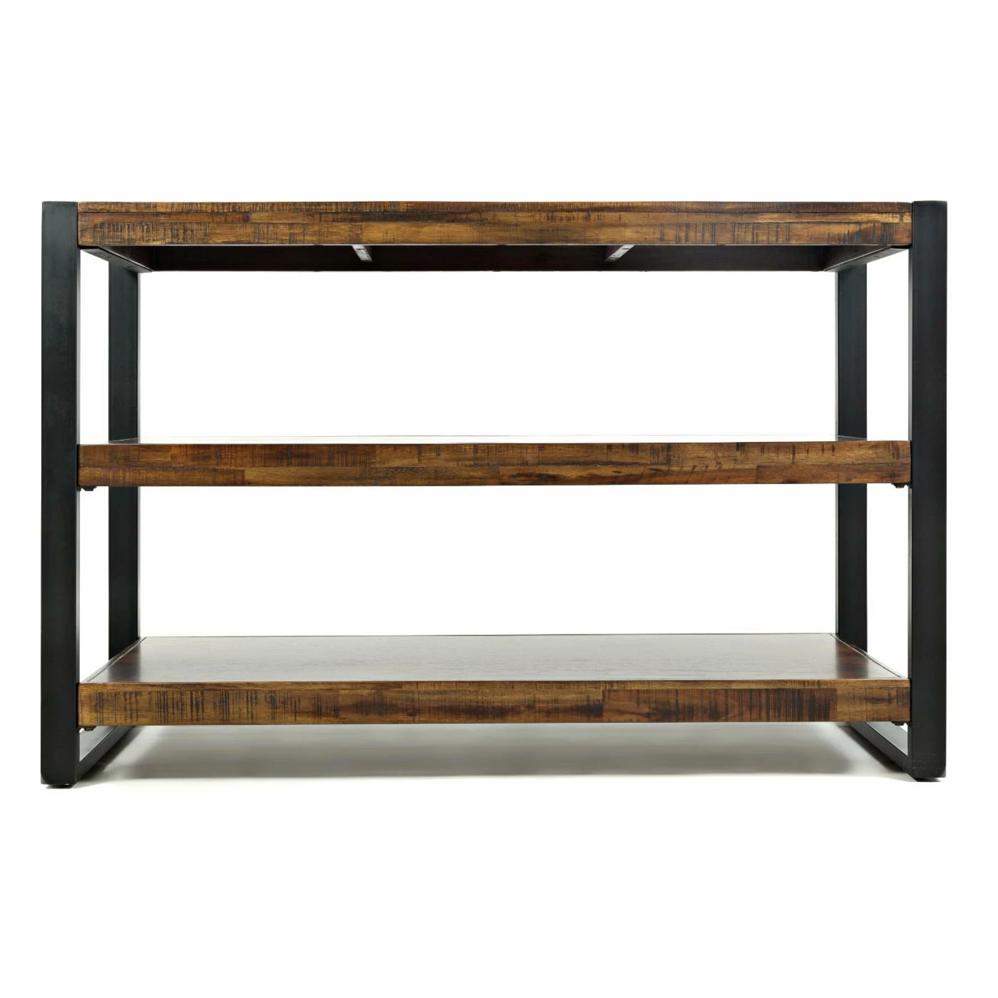 This Jofran Loftworks Sofa Table showcases industrial sophistication in its stellar design. This sofa table is supported by a sleek frame and finished in warm shades of brown and black. A trio of wooden shelves offer ample storage and display space.