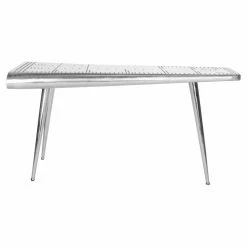 Industrial style takes flight in the design of the Safavieh Aviator Console Table. The engineered wood top is sculpted and riveted to create the illusion that it is formed out of an airplane wing. Tubular iron legs provide plenty of support for the substantial stop and rest stably on capped feet. Finished in a fetching silver, the console will make a sleek statement wherever its displayed.