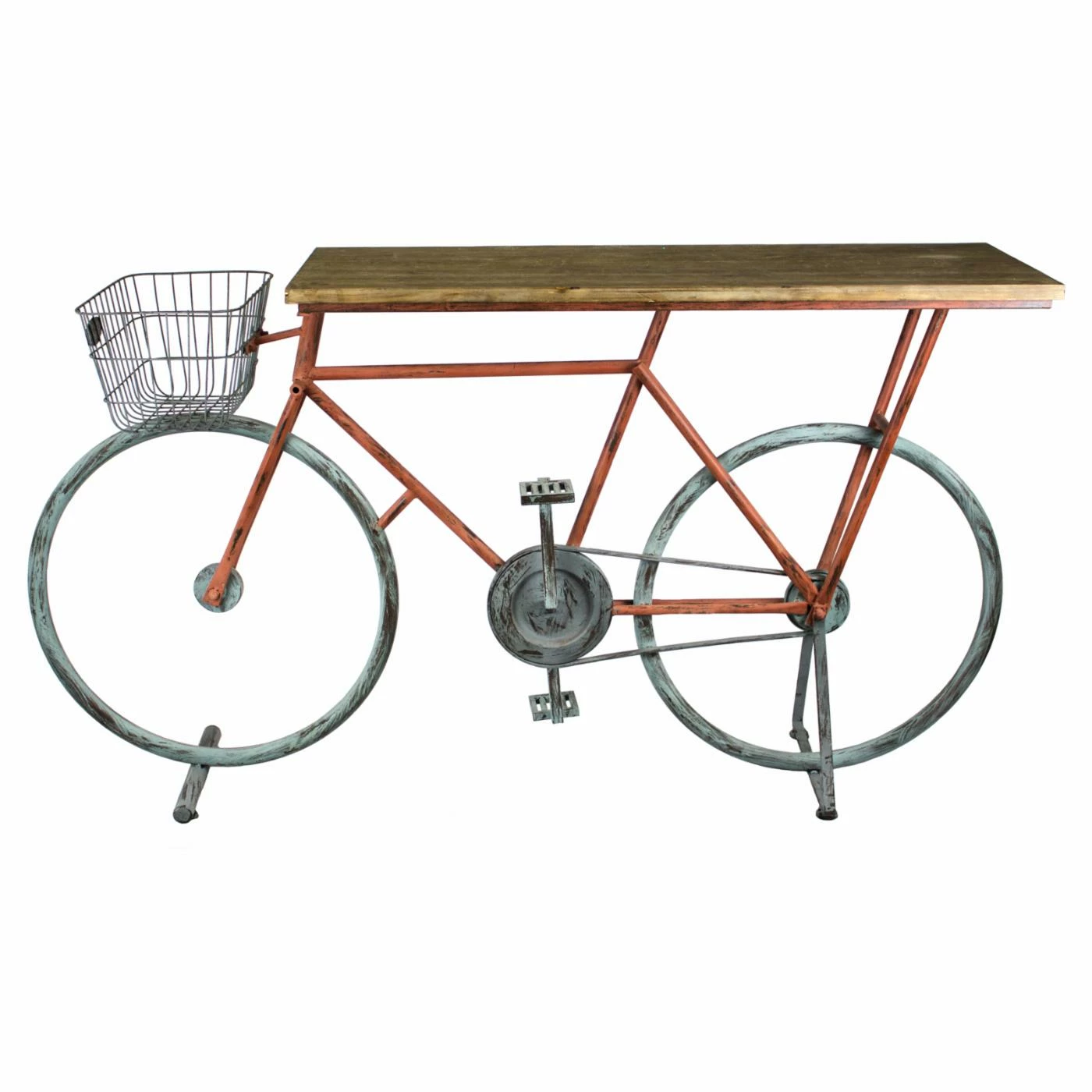 Spark conversations with the clever design of the Sagebrook Home Bicycle Console Table. The metal base resembles an antique bicycle that has been weathered by time. A wood top enhances the rustic appeal of the piece, and a wire basket gives you a place to stash small items like reading materials and remotes.