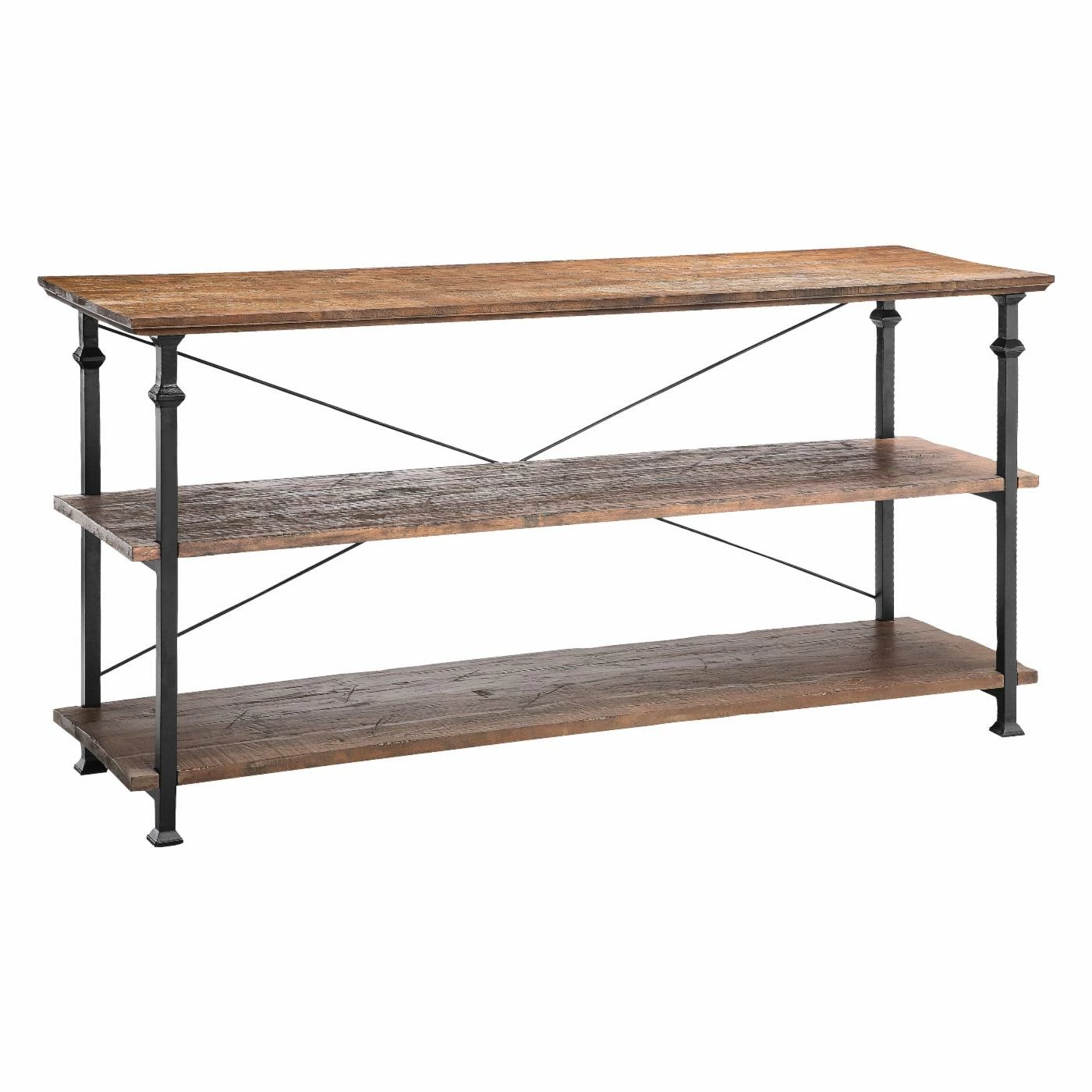 - 3-tiered shelf of iron and reclaimed lumber