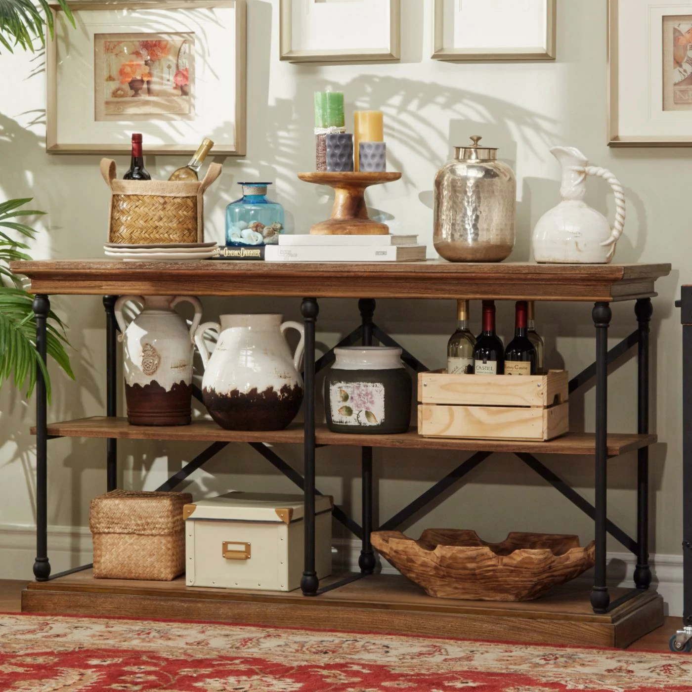 Upgrade your living space, dining room, or entryway with the Weston Home X-Back Sofa Table with Shelf, a powerfully pleasing sofa table with plenty of room for displaying china, ceramic art, or pretty baskets of practical necessities. Crafted of premium engineered wood and metal, this console table fits the mixed-media trend. Choose from available finish options to make it yours. Assembly required.