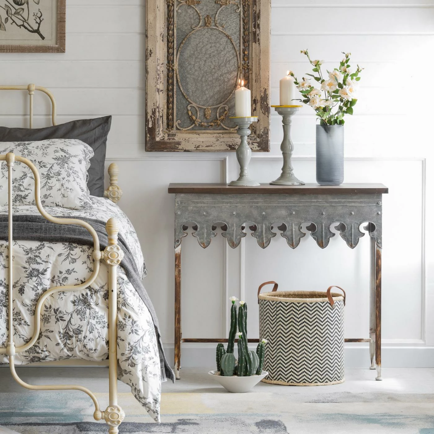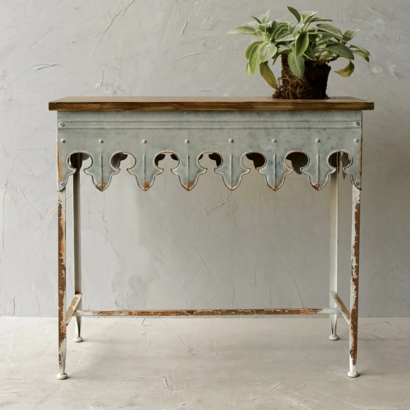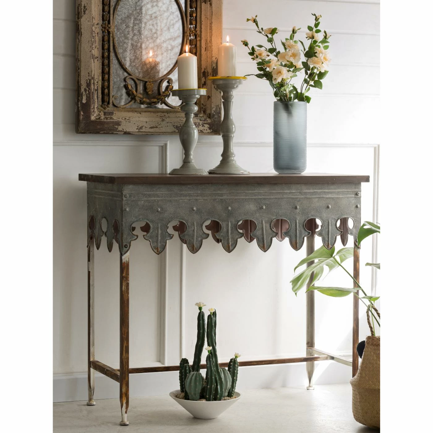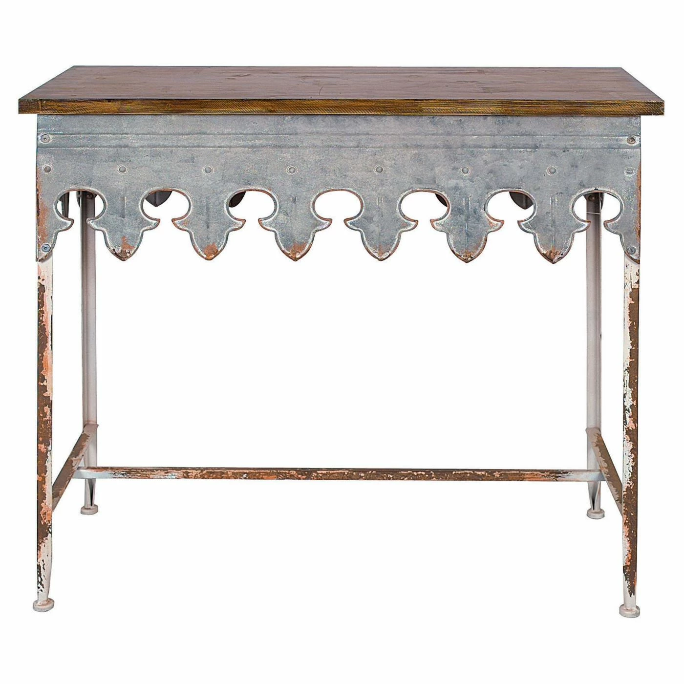Elevate your furniture repertoire in rustic form with the 3R Studios Metal Console Table with Wood Top, featuring metal legs and a decorative, carved metal apron completed in a distressed zinc finish. This unique console table includes a brown wood top that adds a smooth, stable surface so you can display your most treasured items.