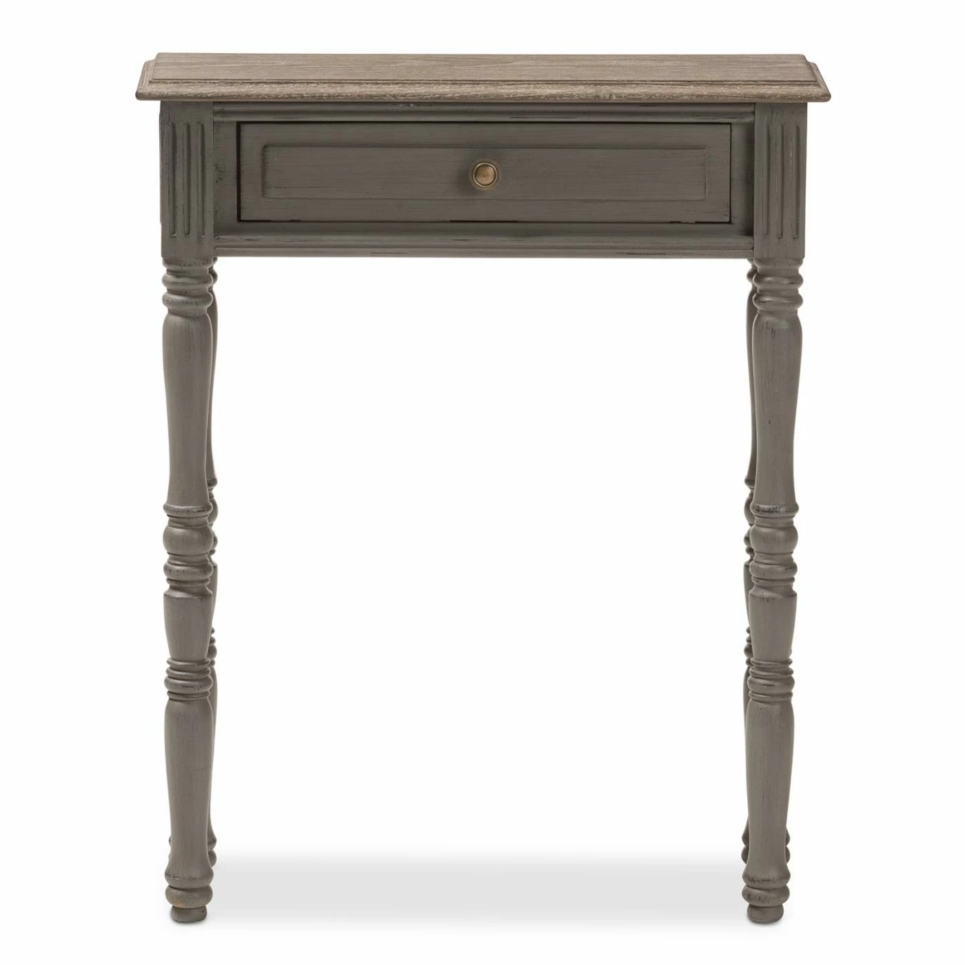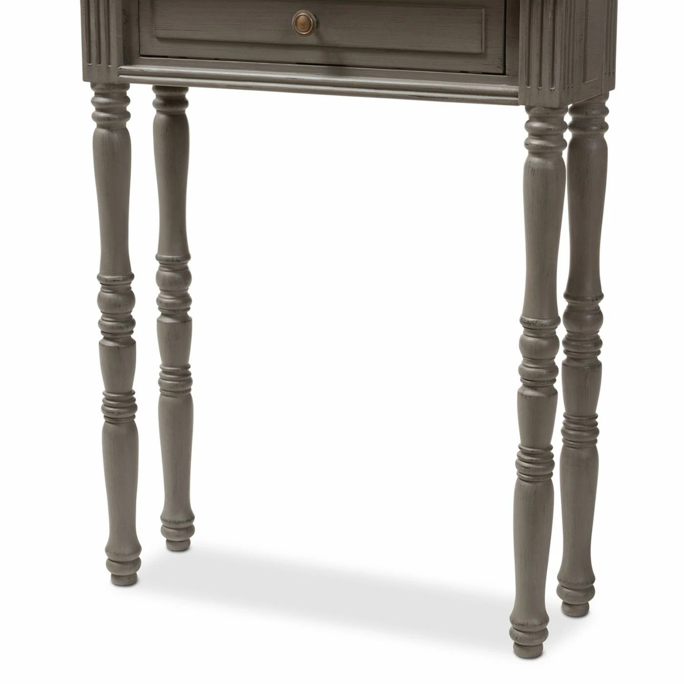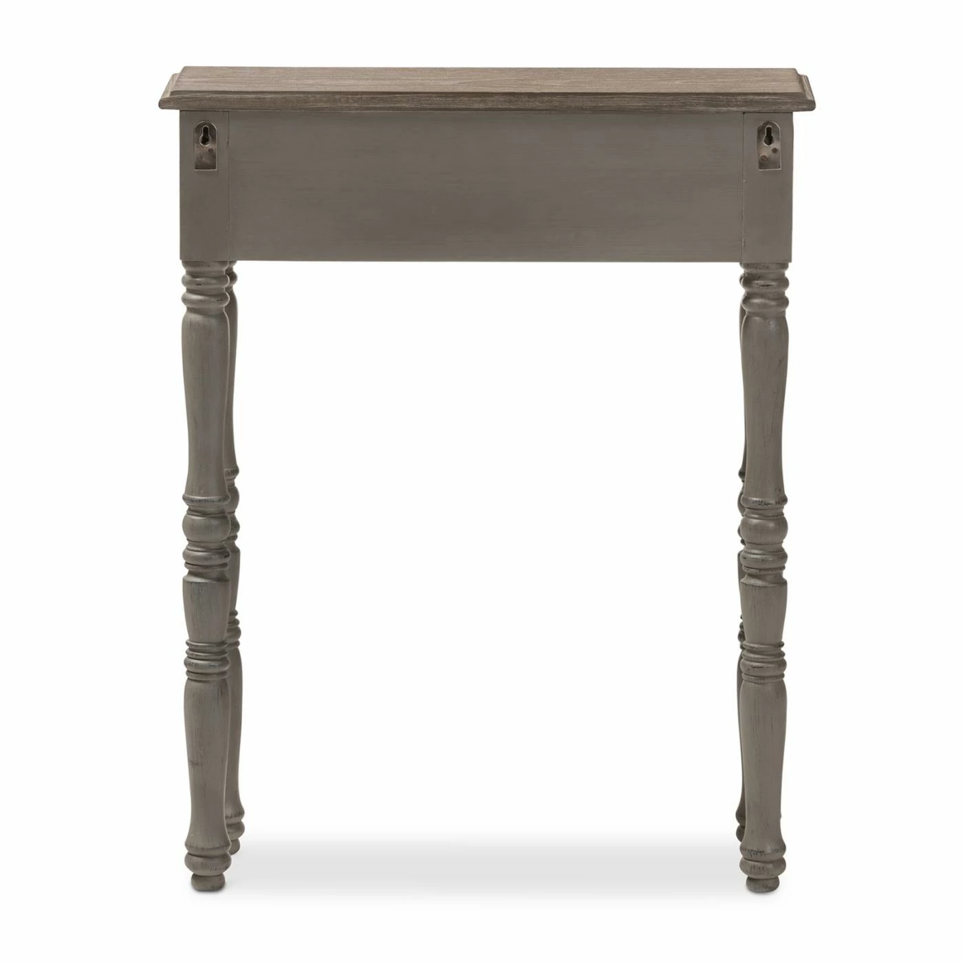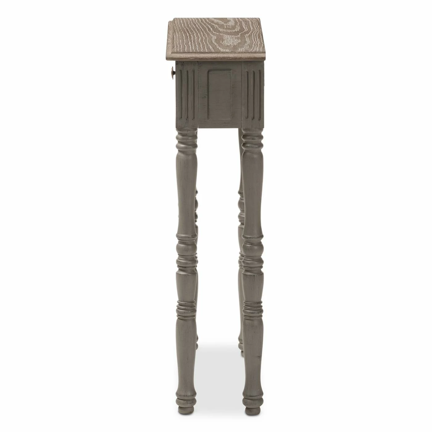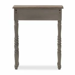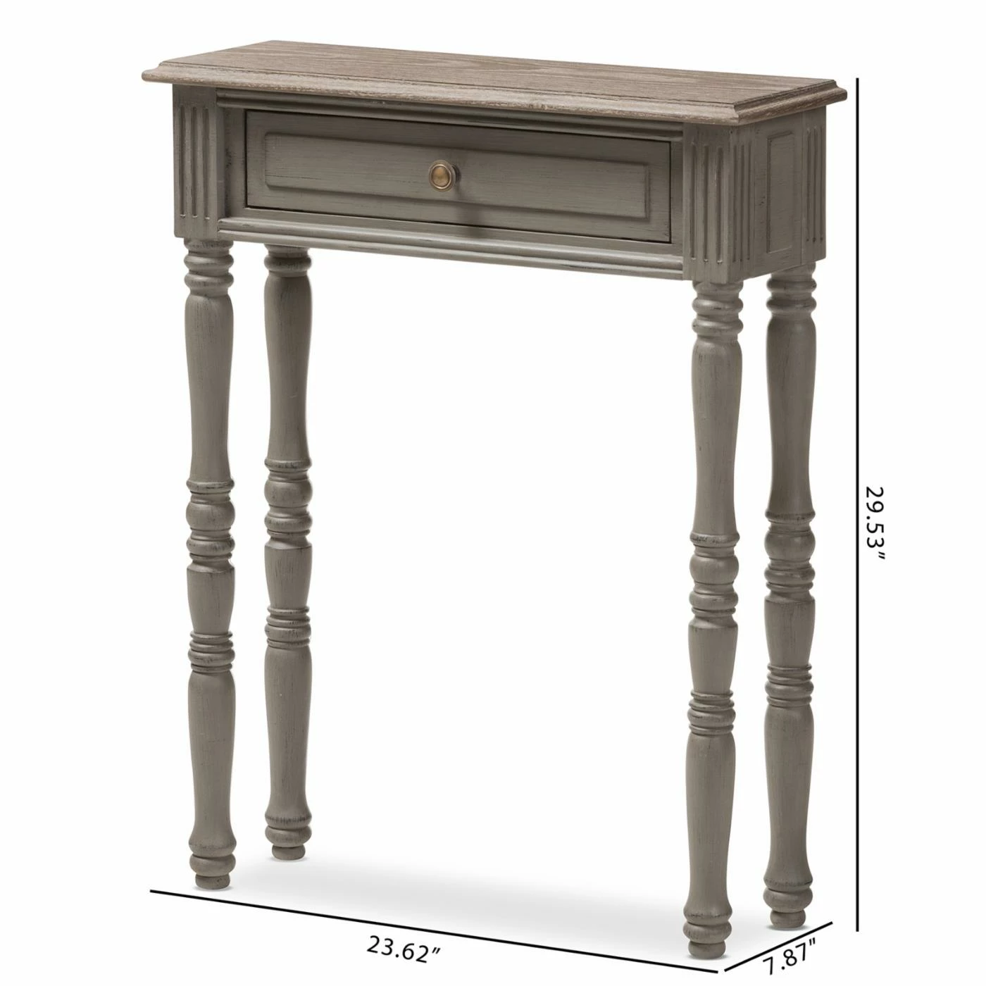 Antique charm radiates from the Baxton Studio Noemie 1 Drawer Cottage Console Table. This exquisite wooden console table boasts ornate ball-turned carving as well as a soothing gray finish. The single drawer offers convenient storage and is complete with a bronze metal pull.
