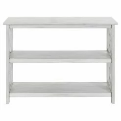 Greet guests with convenient storage in your entryway with the Boraam Jamestown Rectangular Entryway Table. This entryway table boasts two lower shelves to give you plenty of room for display. The sturdy engineered and solid wood design features rustic trestle detailing. A white washed finish completes the vintage look.