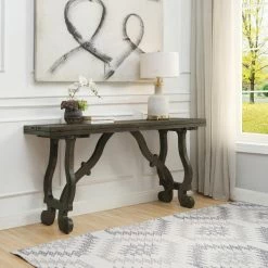 Unfurl its hinged top and watch the Coast to Coast Orchard Park Fold Out Console Table transform from slim entryway essential into a dining table. The table stands on curvy harp legs with matching angled stretchers for an antiqued feel. Its warm brown wood grain finish accentuates the pine wood and lends to the heirloom feel.