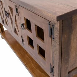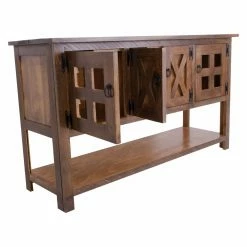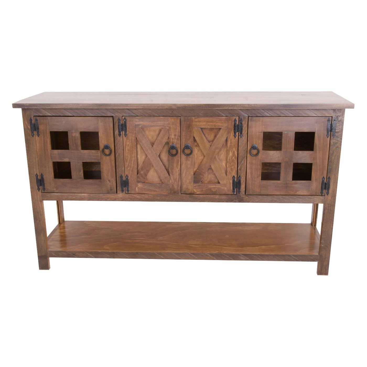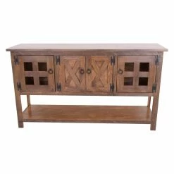 Add a rustic flair to your home with the Eagle Furniture Farm House Sofa Table. Featuring two farmhouse style doors and two framed glass doors, this piece elevates the style of any home. Three cabinet areas are perfect for storing books, papers, office supplies, and more while the large bottom shelf gives you a place to display your favorite decorative pieces. Strong and durable, this pine wood sofa table is built to last. With a selection of available finishes to choose from, this piece will blend seamlessly with your current color scheme.