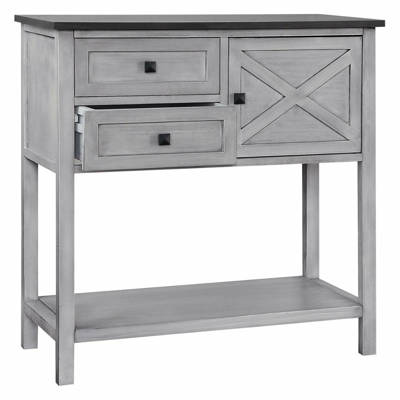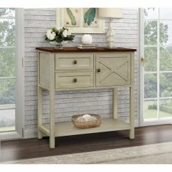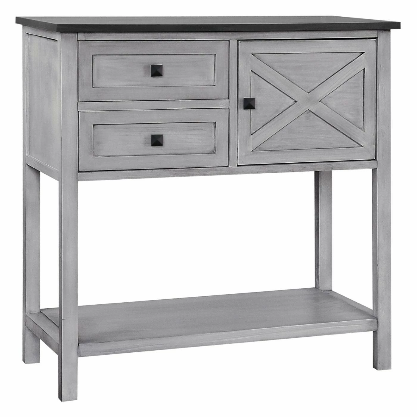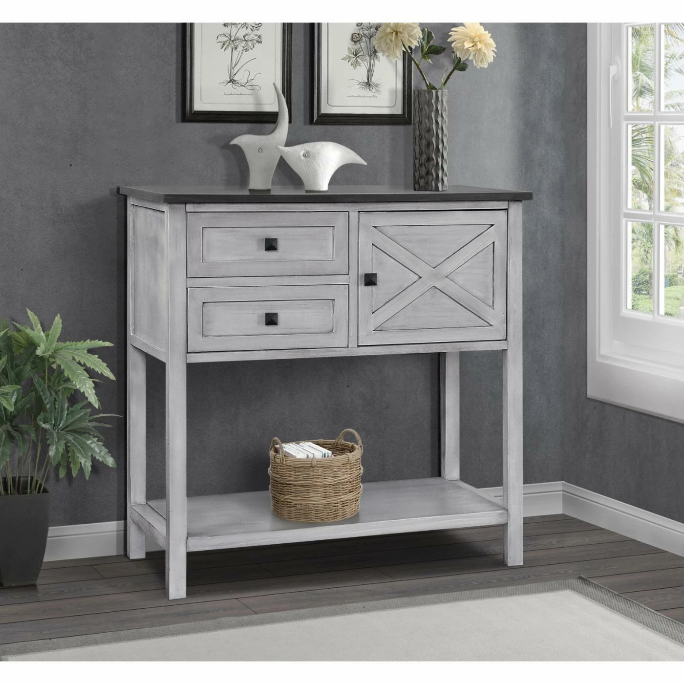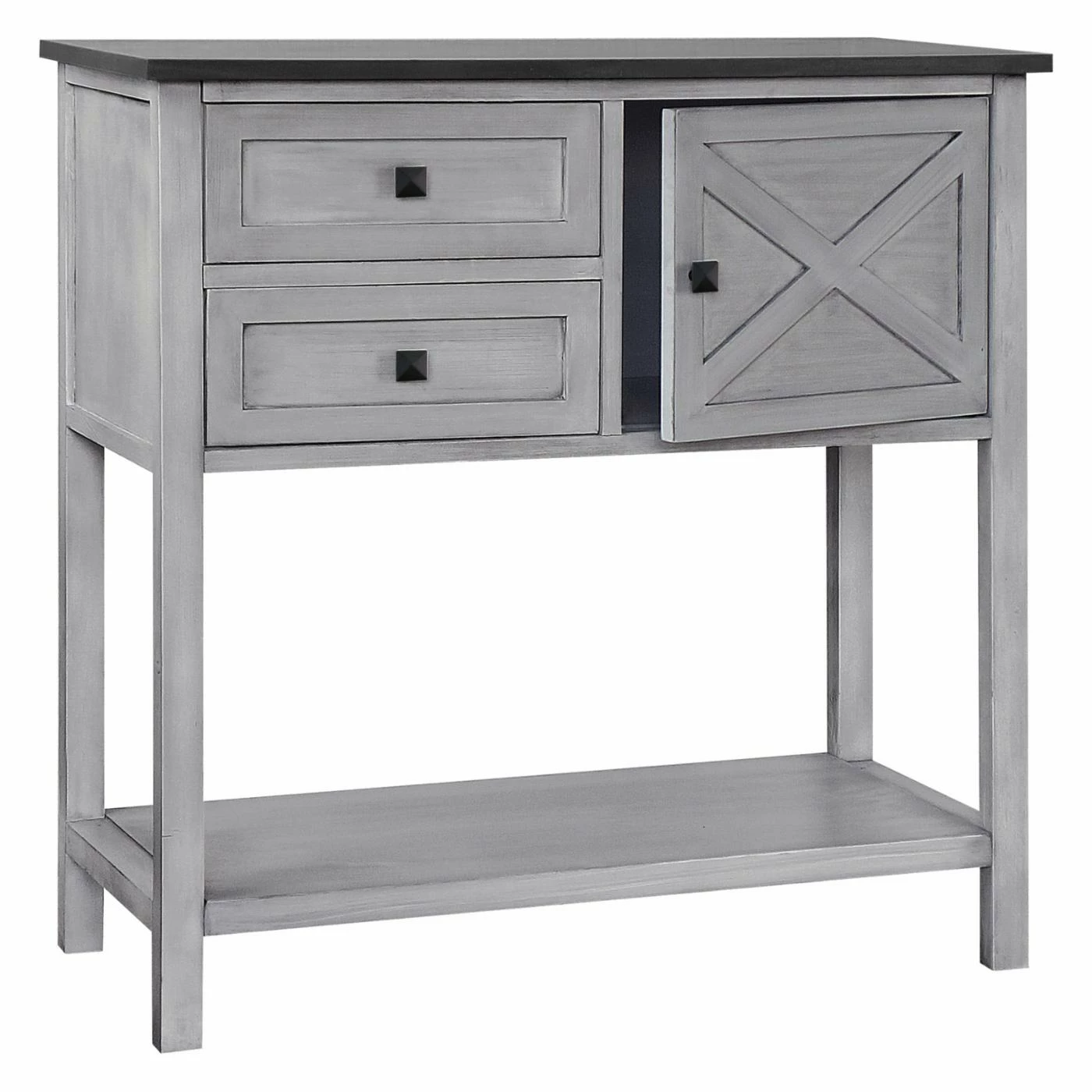 Give your home a rustic vibe with the Gallerie Decor Framingham Farmhouse Console Table. This console table features a sturdy wood construction in your choice of available finish, so you can get the right match for your décor. Two drawers and a door offer plenty of concealed storage space, and the bottom shelf supplies extra surface space as well.