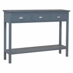The Gallerie Decor Newport Console โ Gray is crafted from sturdy wood with a stylish gray finish. Three side-by-side drawers featuring apothecary-style handles offer concealed storage, while the table top and lower shelf provide space for display. The size of this console table is perfect for an entryway or hallway.ย Assembly required.