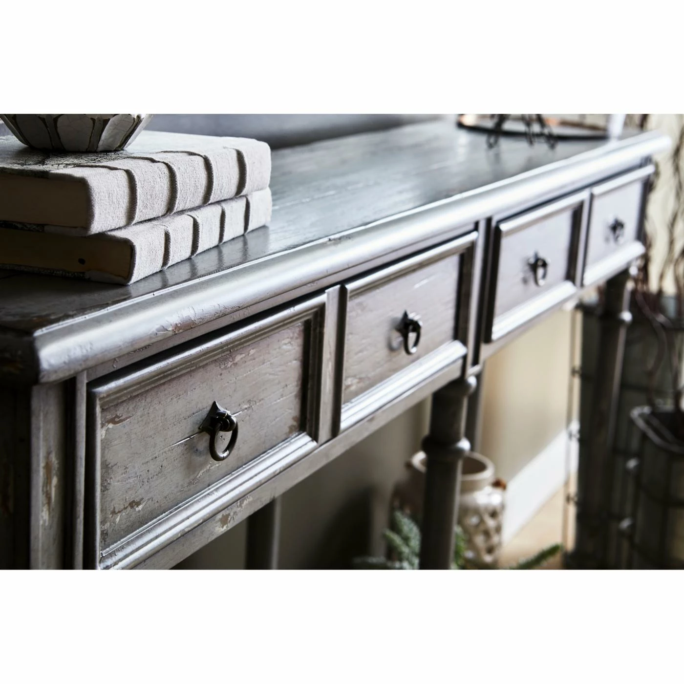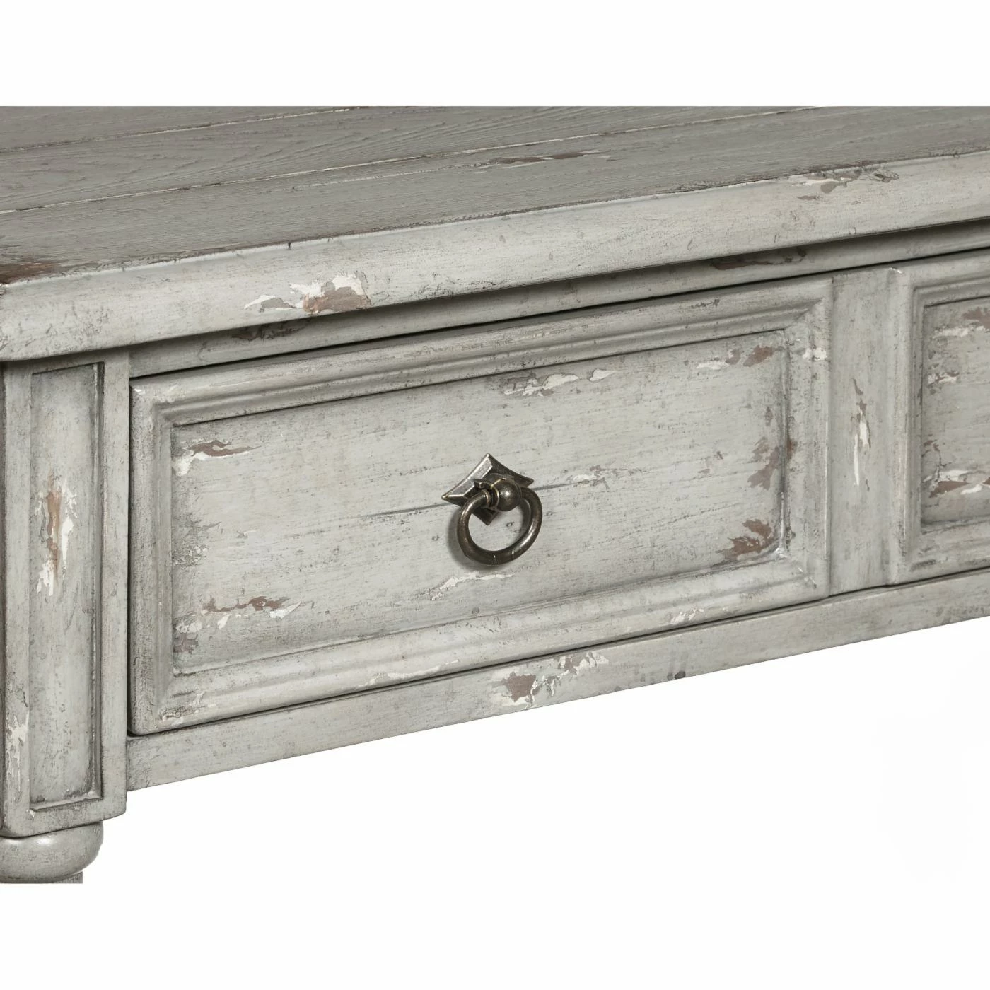 The HomeFare Distressed 2 Drawer Console Table is full of thoughtful details that make it easily mistaken for a real vintage find. Long and slender legs have turned knobs which draw the eye and each drawer has two antiqued brass ring pulls. And, of course, the table is finished in a soft gray which has been heavily distressed by hand to reveal the wood undertones beneath. Use the console top or the lower fixed shelf to display your favorite decorative accents.
