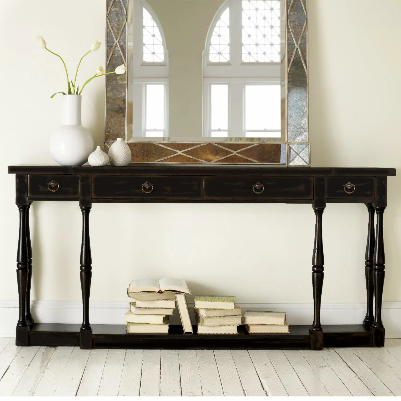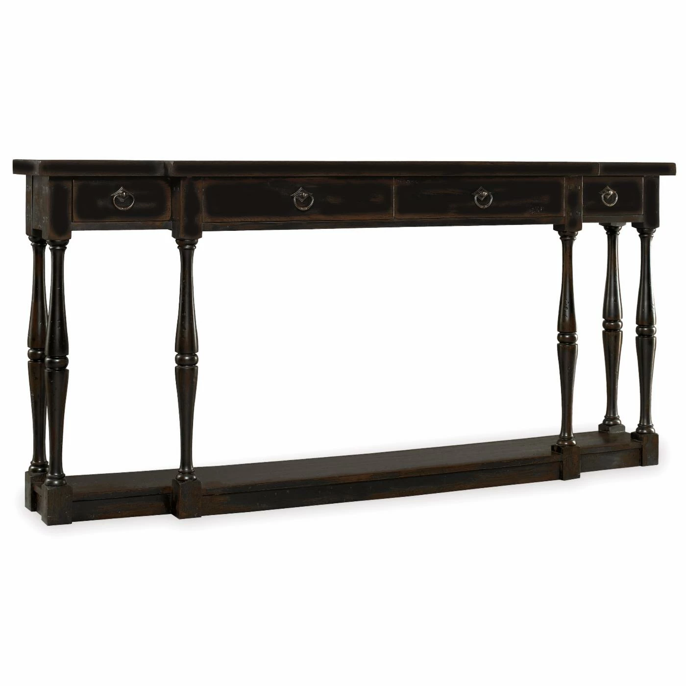 Solve the scant-space-for-style conundrum with the Ebony 4 Drawer Thin Console. We all have that place – an entry or hallway – where it looks naked with nothing, but everything is too bulky to fit. Not anymore This console is ultra thin and features turned spindle legs so it won’t look too big or bulky. The ebony rub-through finish is the perfect touch, and 4-drawer storage means you can hide stuff in it too. Perfect!