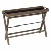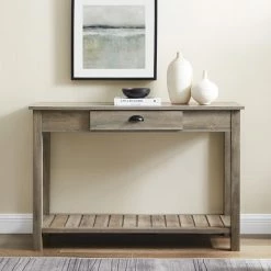 Not only does it offer a farmhouse style that’s inviting and charming, the HumbleNest Farmers Market Weathered Console Table also provides practical function. This console table features a straight-lined design with a central drawer and a slat-style shelf across the bottom.