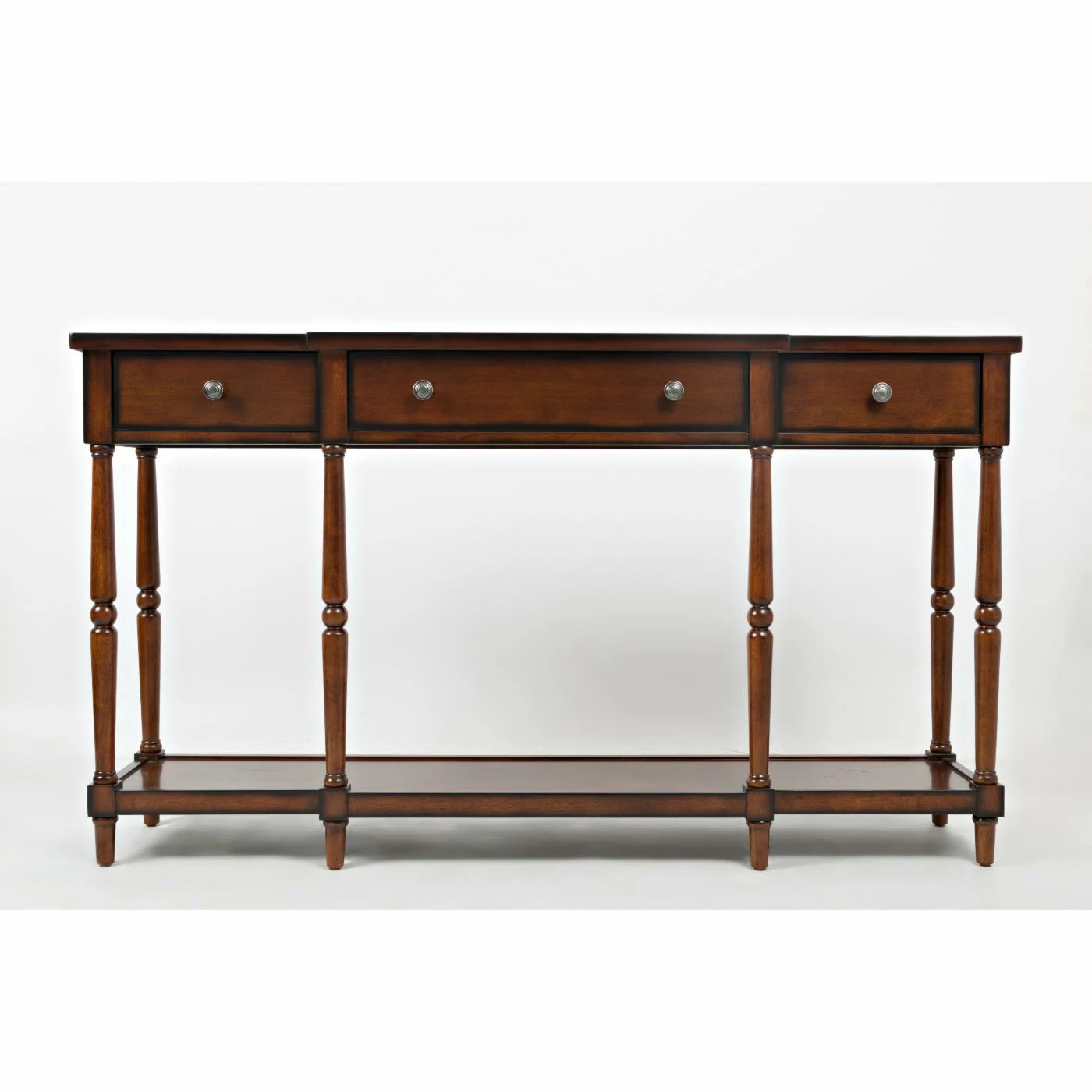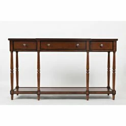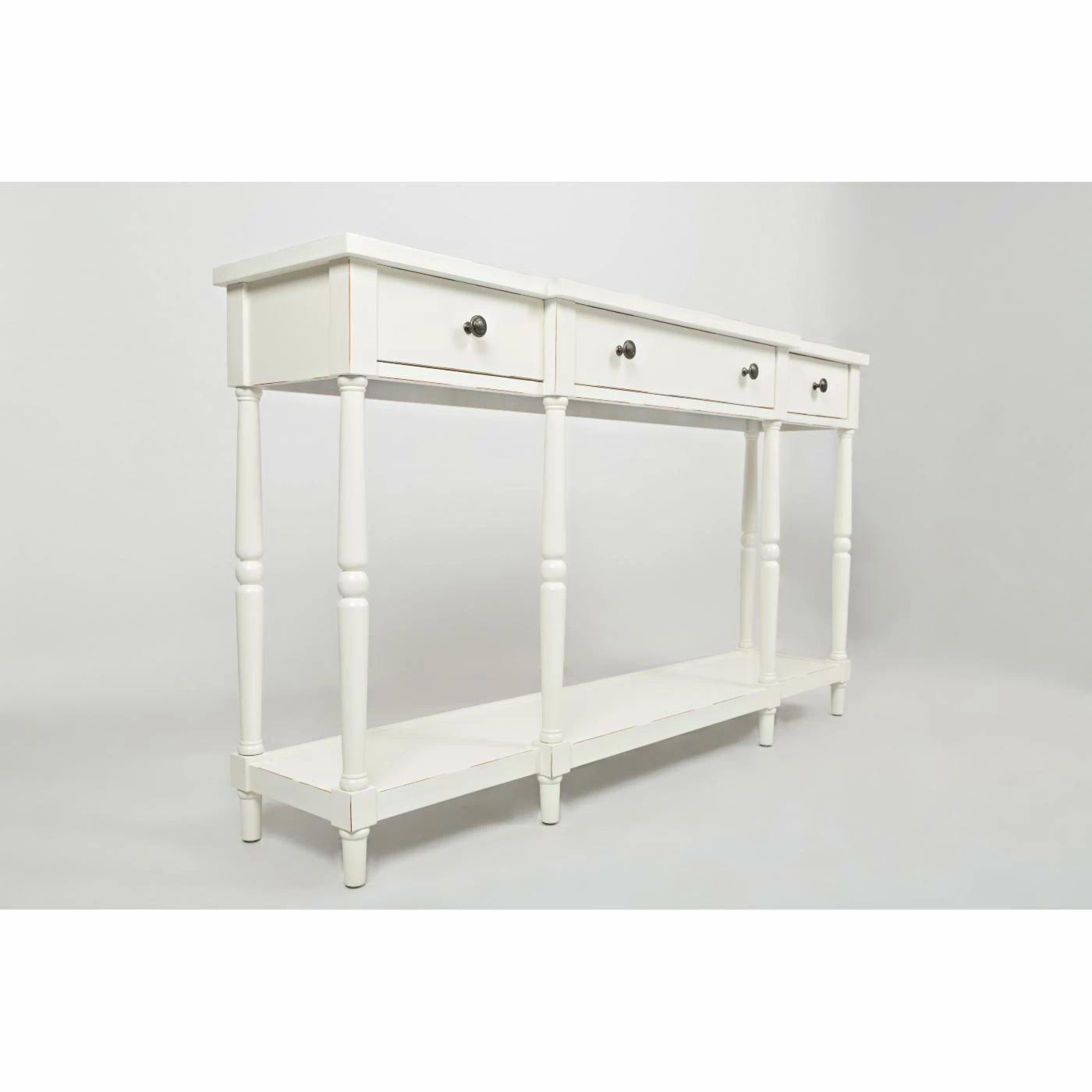 A charming cottage-style design and plentiful storage options make the Jofran Stately Home Console Table a welcome addition to your bedroom or living room. This piece is constructed from solid Asian hardwoods with turned legs. A wide lower shelf provides space for storage bins and large items. A wide center drawer and two smaller side drawers provide catch-all storage. Select from the available finish options.