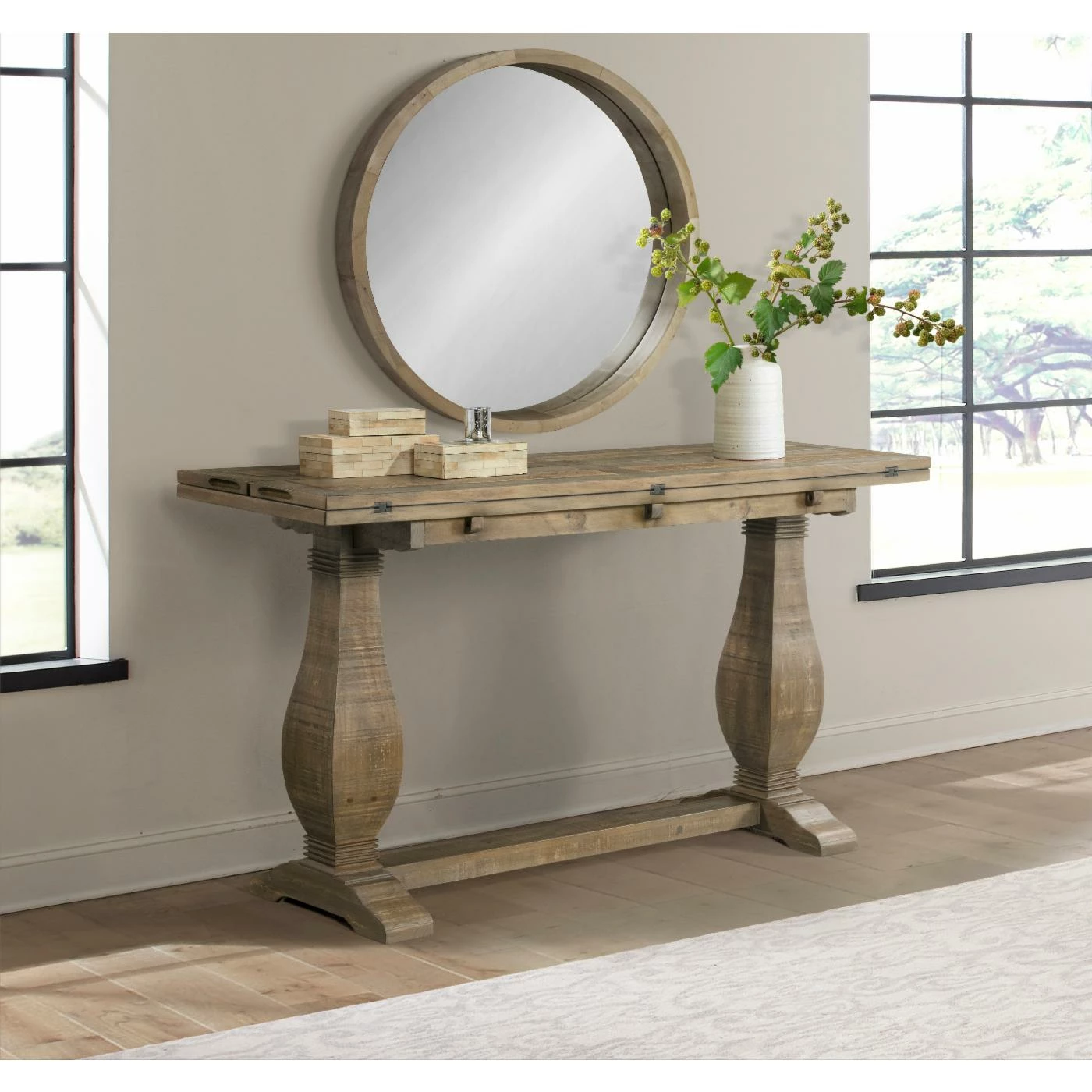 - Solid wood construction and wormwood and purposeful distress marked details