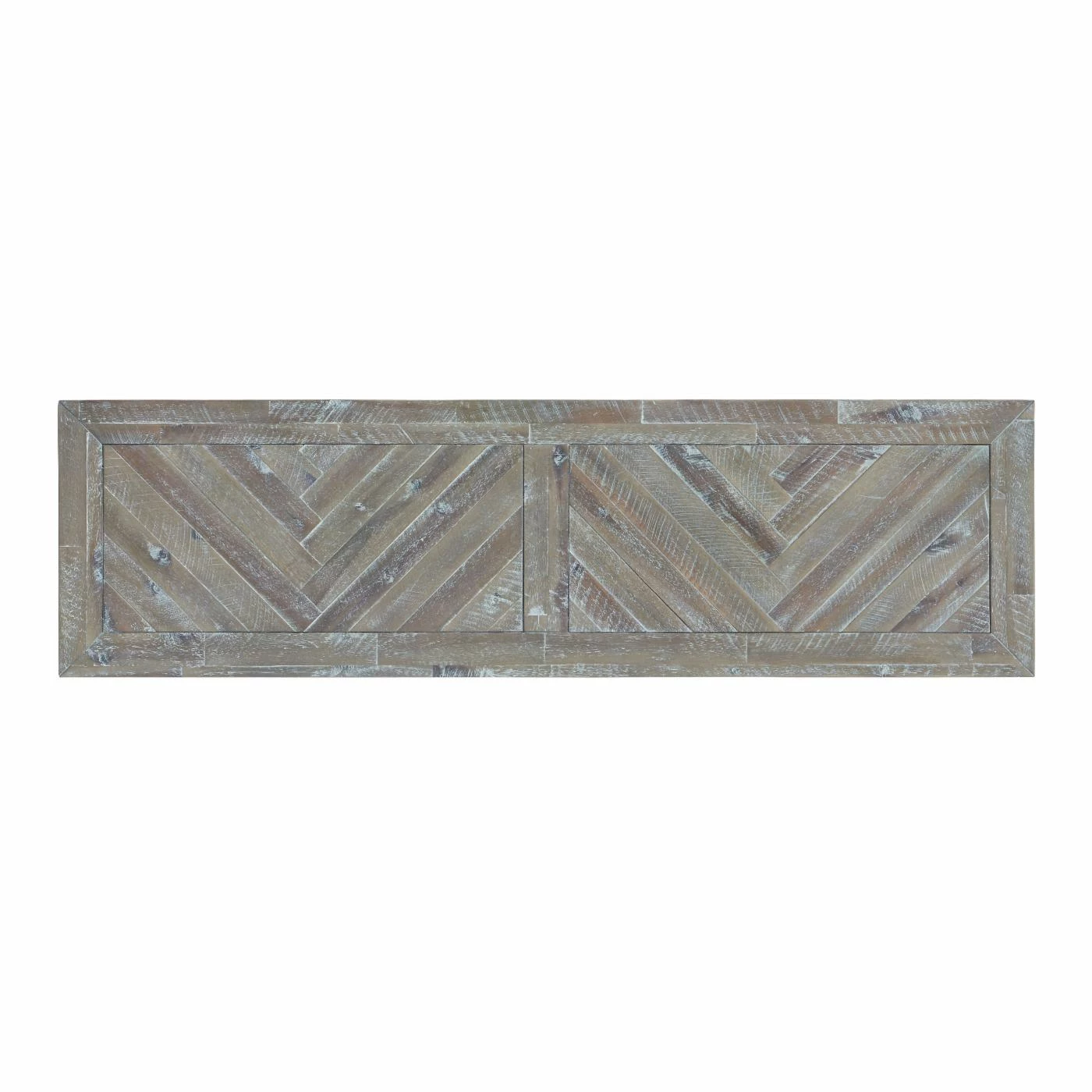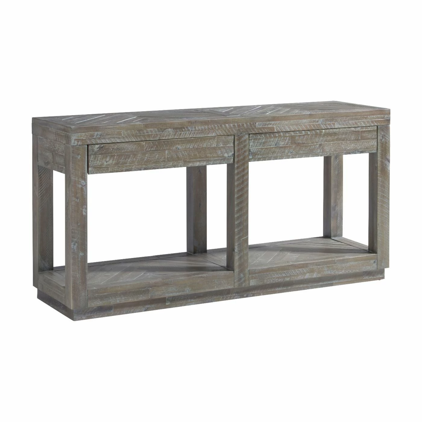 Bring a reclaimed farmhouse style to your décor with the Modus Herringbone Solid Wood 2 Drawer Console. The frame is crafted from acacia wood pieces. The tabletop features a herringbone pattern construction. The rustic latte finish was applied using a wire brush, lending to a handmade look. For storage, tow drawers and a lower open shelf provide adequate space.