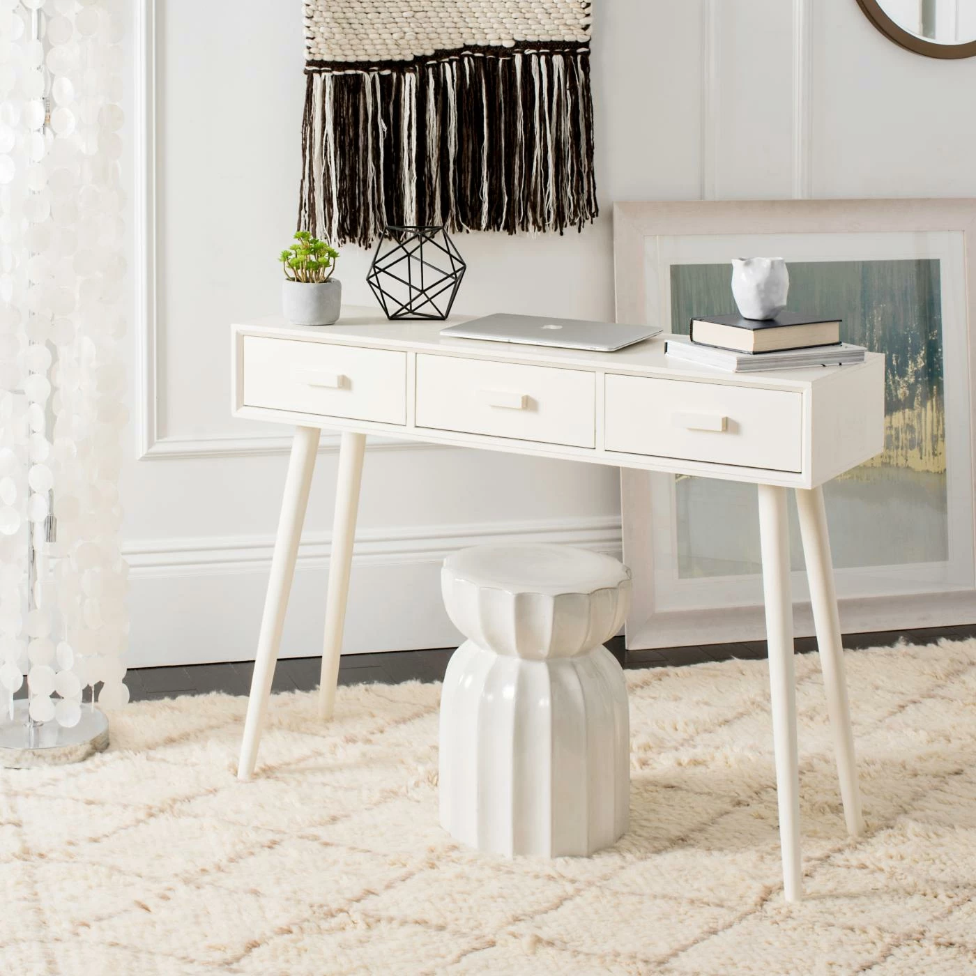 From Montreal to Miami, the Safavieh Albus 3 Drawer Console Table blends right in with your uniquely local dΓ©cor. Engineered pine wears a lightly distressed white finish. Tuck practical necessities into three convenient drawers with white wooden pulls.