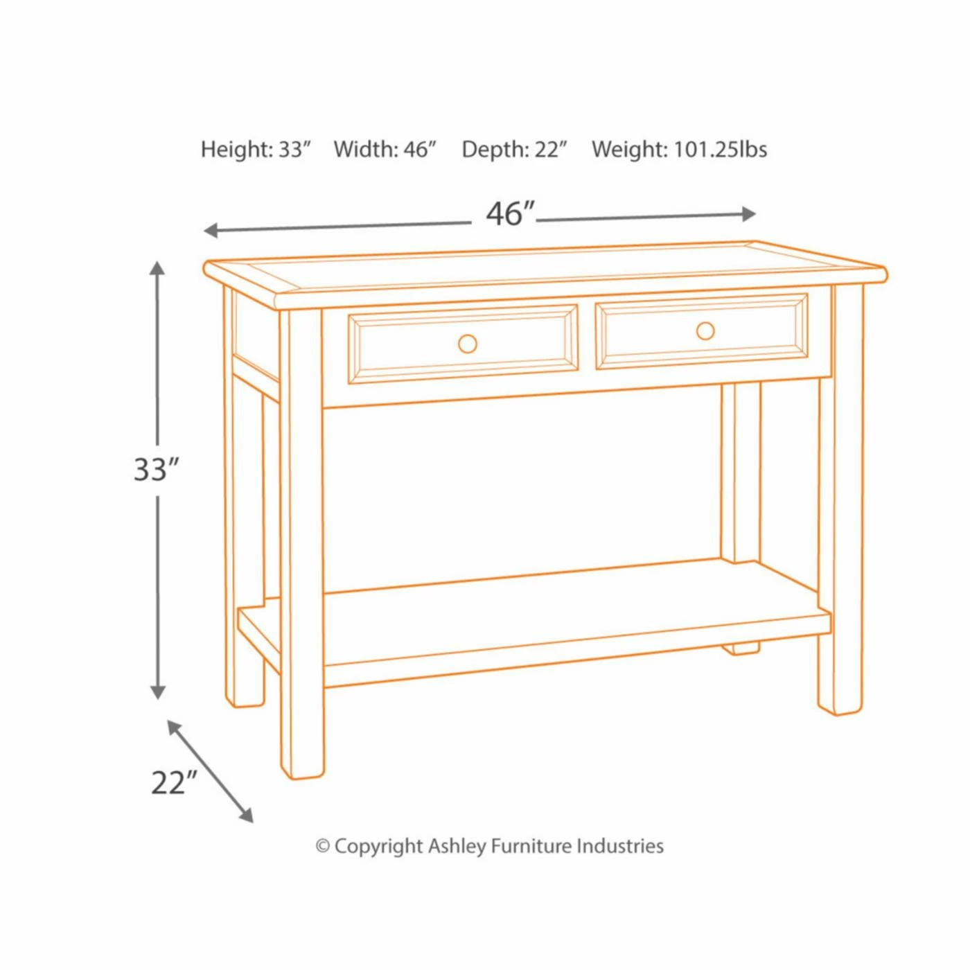 Bearing a distressed white and natural brown finish on white oak veneers, the Signature Design by Ashley Bolanburg Rectangular 2 Drawer Sofa Table brings a touch of country charm to seating areas. The solid and engineered wood sofa table features side-by-side double drawers for managing clutter. Below, an open shelf gives you storage space for reading materials, board games, baskets, or decorative accents.