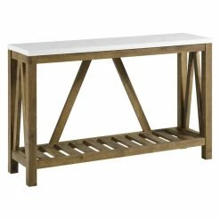 Make a strong first impression when guests enter your home with the Walker Edison A-Frame Rustic Entry Console Table. This charming piece has an A-frame design on three sides with wide slats along the bottom shelf. The top of the table boasts a faux marble finish, while the frame is crafted from high-grade engineered wood that won’t warp or crack with a laminate exterior. The faux marble contrasts the walnut finish of the frame for a becoming look that would suit any space.