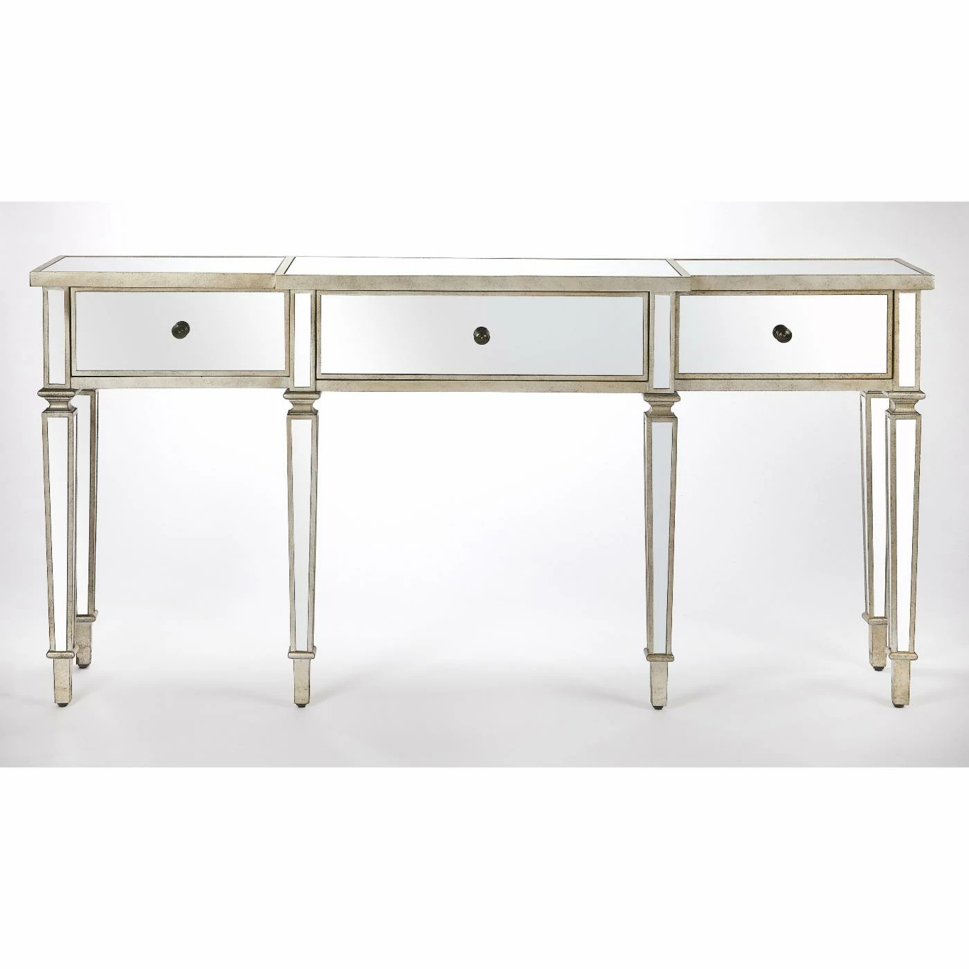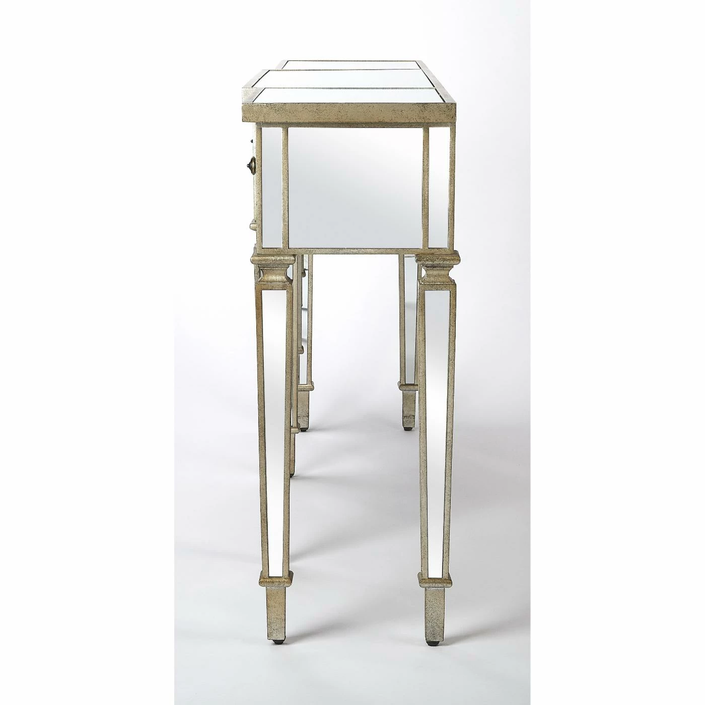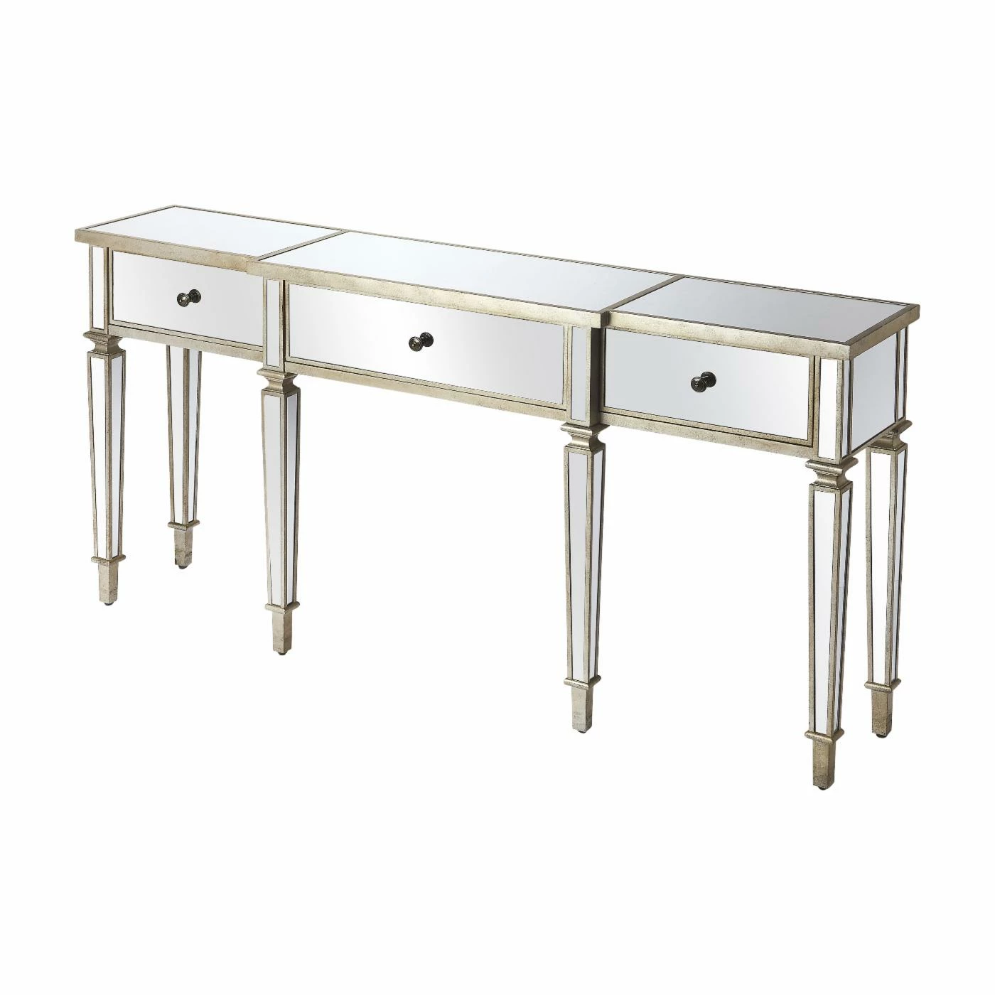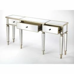Add a little glitz to your living room or entryway with the Butler Specialty Hayworth Mirrored Console Table. Store items in the three drawers and display a couple of table lamps, a beautiful bouquet, or your favorite figurines on top. The console table has all mirrored surfaces, tapered legs, and antique gold-finished edges for plenty of glam.