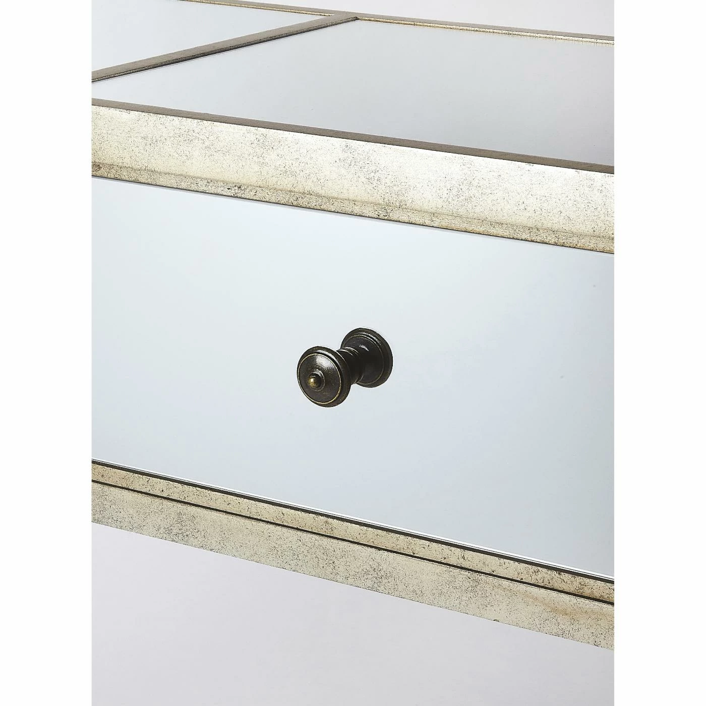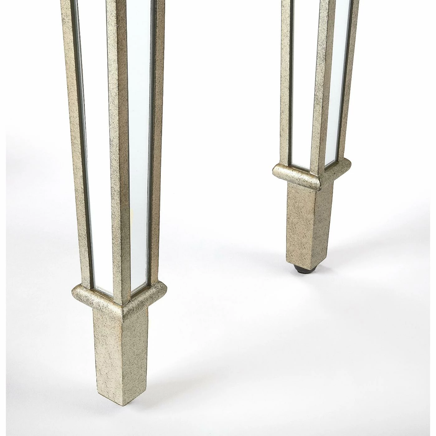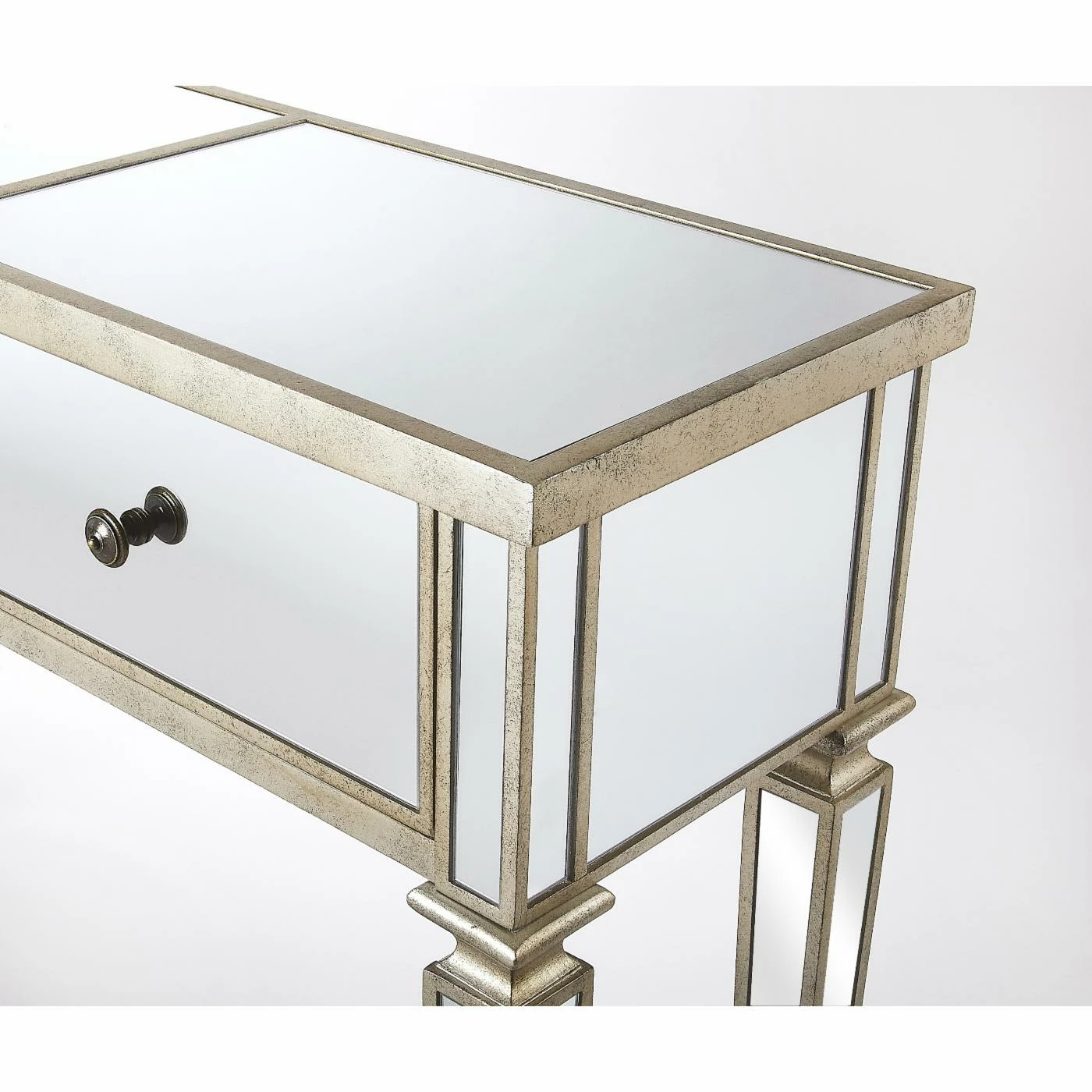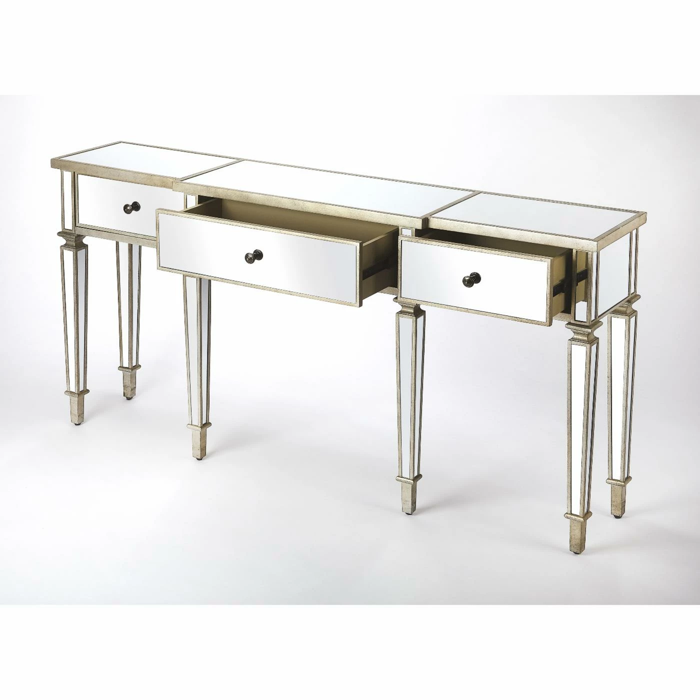 Add a little glitz to your living room or entryway with the Butler Specialty Hayworth Mirrored Console Table. Store items in the three drawers and display a couple of table lamps, a beautiful bouquet, or your favorite figurines on top. The console table has all mirrored surfaces, tapered legs, and antique gold-finished edges for plenty of glam.