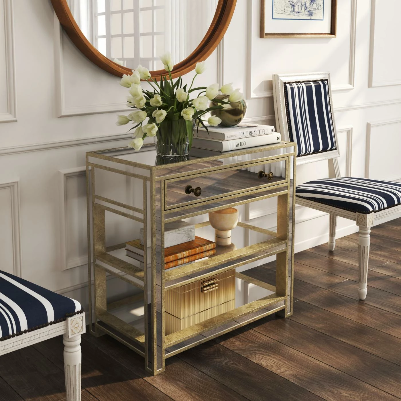 The mirrored Butler Specialty Masterpiece Miranda Console Table was designed to reflect your chic style. This console table is ideal in your entryway or the hall. It features elegant antique mirror inlays on its top, legs, drawer front, and shelves. The antique mirror gets added glamour from the striking pewter finished trim. This console table is handcrafted from select hardwood solids and wood products with antique brass-finished hardware.