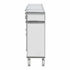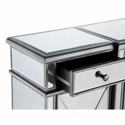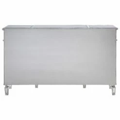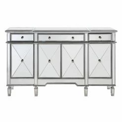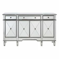 Make sure you’re never without stylish storage thanks to the Elegant Furniture & Lighting Danville Console Table. This wide console table has a sleek, contemporary look that incorporates a variety of storage solutions into its durable wooden frame. Tapered block feet support the design, all finished in a bright, beautiful silver color. The surface of the table is also inset with a number of panels for breathtaking reflection of ambient light. Three drawers offer convenient at-hand storage while two single-door cabinets and one double-door cabinet offer additional long-term storage; each cabinet opens to reveal an adjustable shelf.