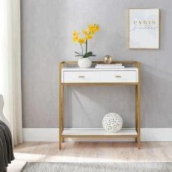 Glittering gold metalwork with X motif and raised top gallery rail frames the Leick Home Claudette Console Table. Compactly scaled to accommodate smaller spaces, this table delivers enclosed drawer storage and show-stopping display surfaces on the top and lower shelf.