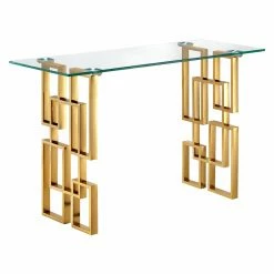 Style the Meridian Furniture Inc Pierre Gold Console Table in your entryway or in the front hall for a glamorous look and chic display space. This console table is graced by a geometric stainless steel leg base in a gleaming gold finish. A thick tempered glass top allows you to fully experience the sculptural base from all angles. Combine this console table with others in the Pierre collection for a cohesive look throughout your living space.