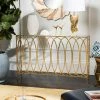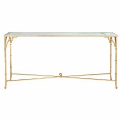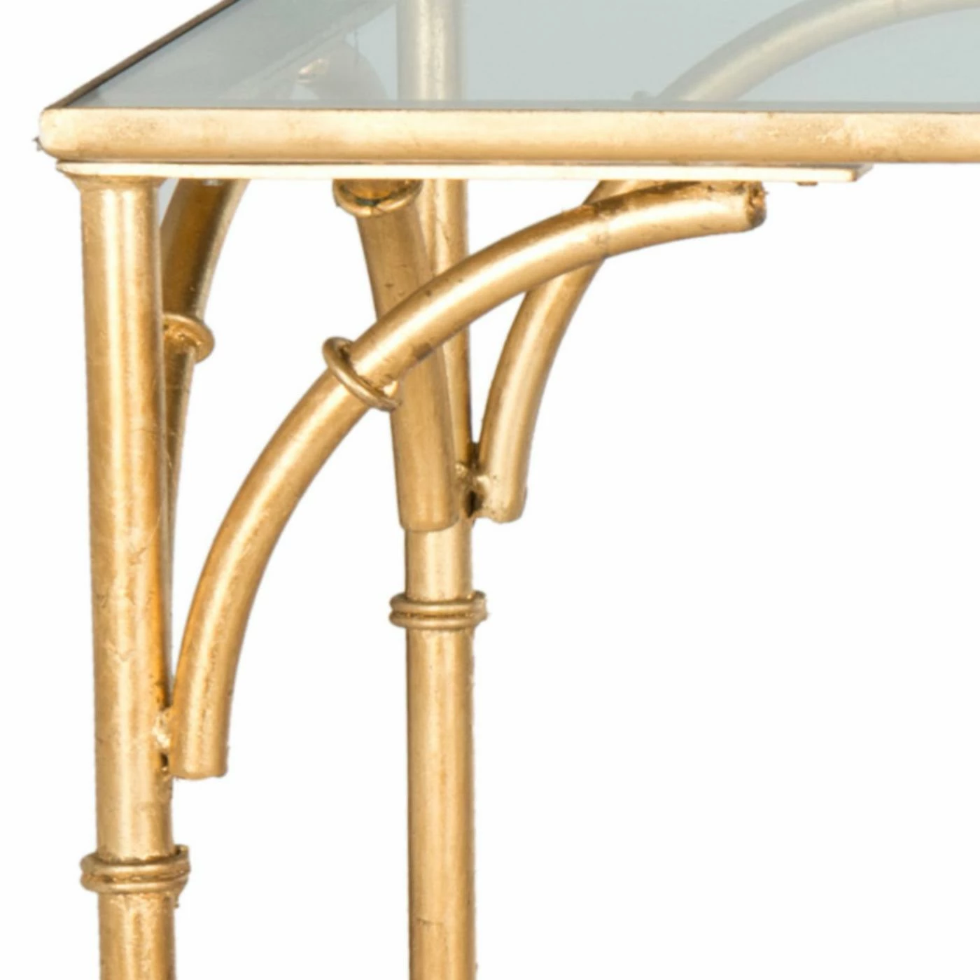 Textured iron legs in a glowing metallic finish make it seem as if the Safavieh Maurice Console Table rests on gilded bamboo reeds. For a touch of traditional elegance, the legs are joined by crisscross iron stretchers that meet at a ball finial. Tempered glass adds a final touch of shine to the design.