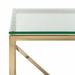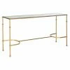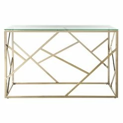 The lustrous brass-tone Safavieh Namiko Console Table has an unmistakably modern look. The metal frame boasts an openwork design composed of straight lines and sharp angles. A clear glass panel sits on top, and its sleek, unframed design enhances this table’s clean profile. It’s an ideal choice for fans of geometric decor, and this table makes a fine addition to a glam theme.