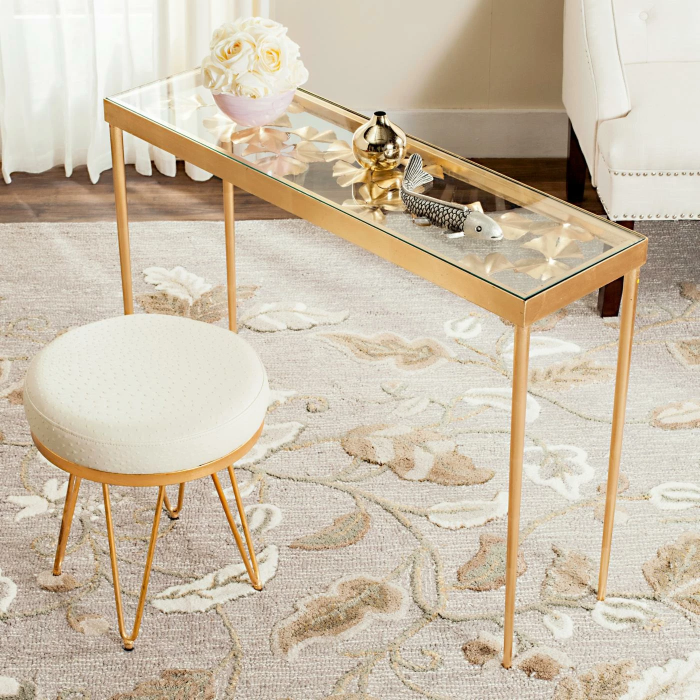 The Safavieh Otto Ginkgo Leaf Console draws inspiration from the design of a table commissioned by an Italian prince for his Tuscan villa. Along the clear, tempered glass top, three-dimensional gold leaf iron ginkgo leaves catch the eye. To keep the emphasis on the ornate ironwork accents, the table features a simple iron frame with slender, tapered round legs.