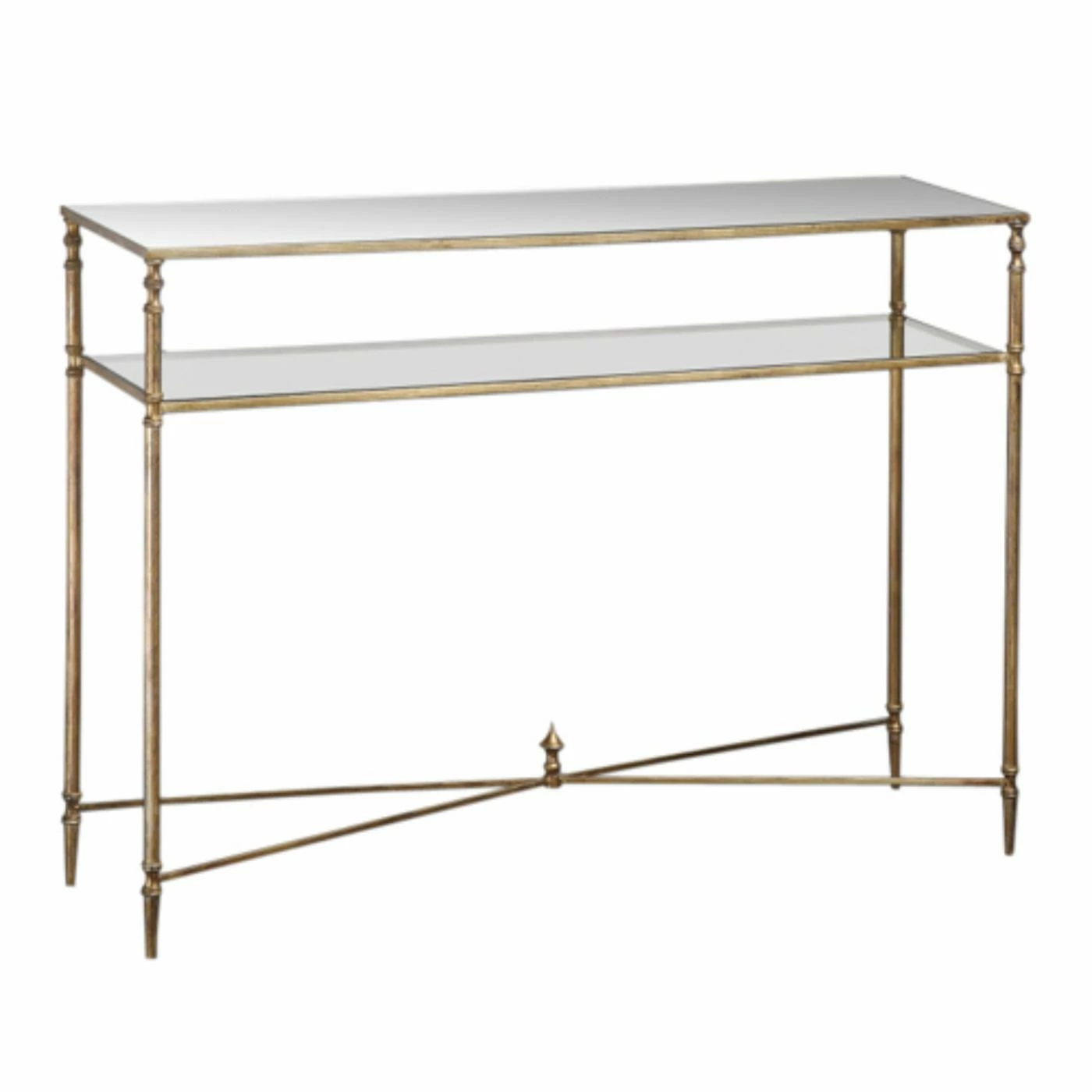 Bound to catch the minimalist’s eye, the Uttermost 24278 Henzler Console Table brings a light and airy feel to any room. It has a reinforced mirror surface at the top and a gallery shelf that uses clear tempered glass. A forged iron frame and iron cross stretchers offer a sturdy and durable build, and the table is made more decorative with an attractive antique finish. This console table is sure to reflect your exquisite taste.