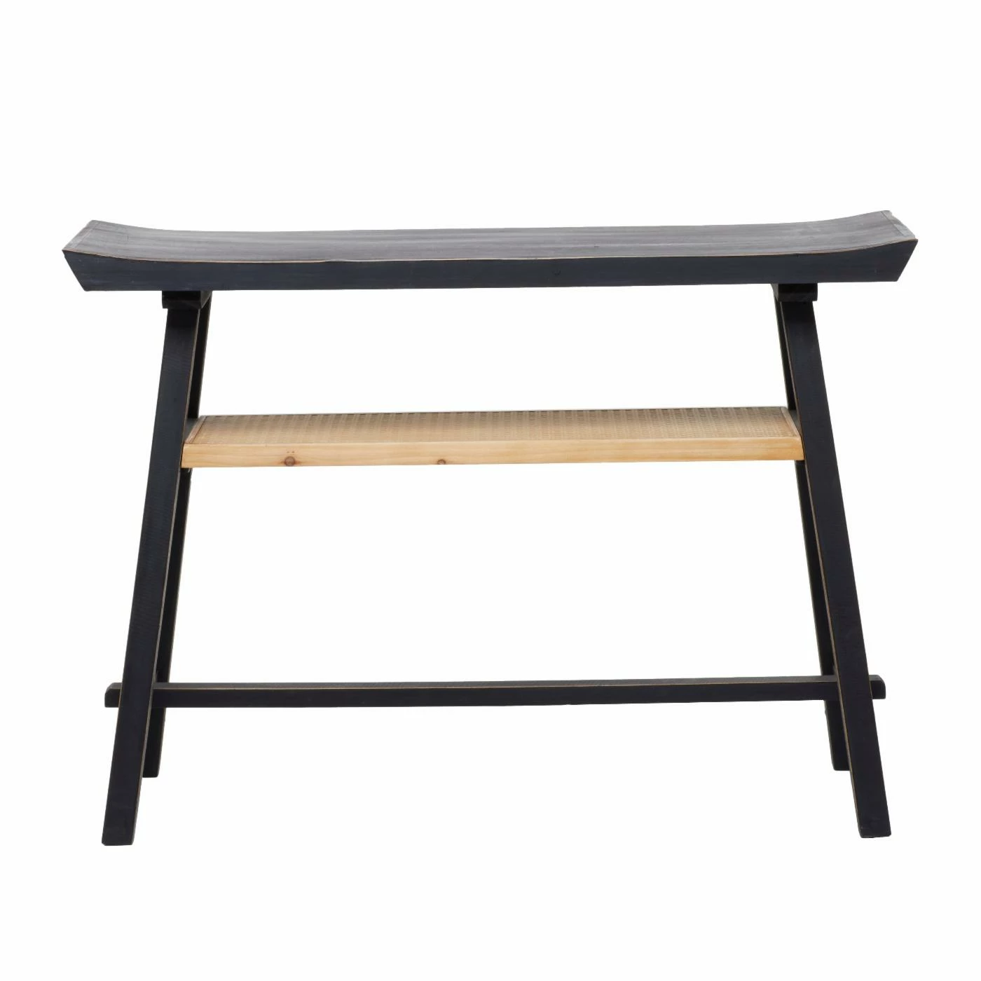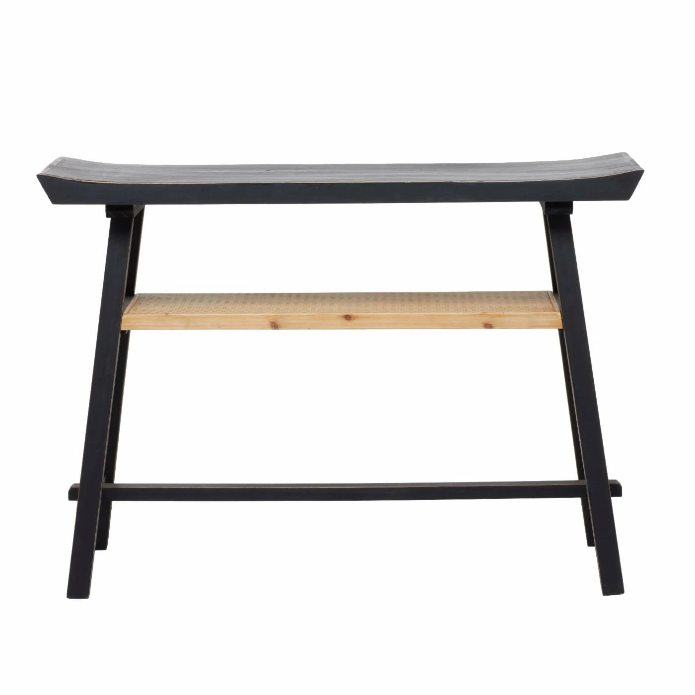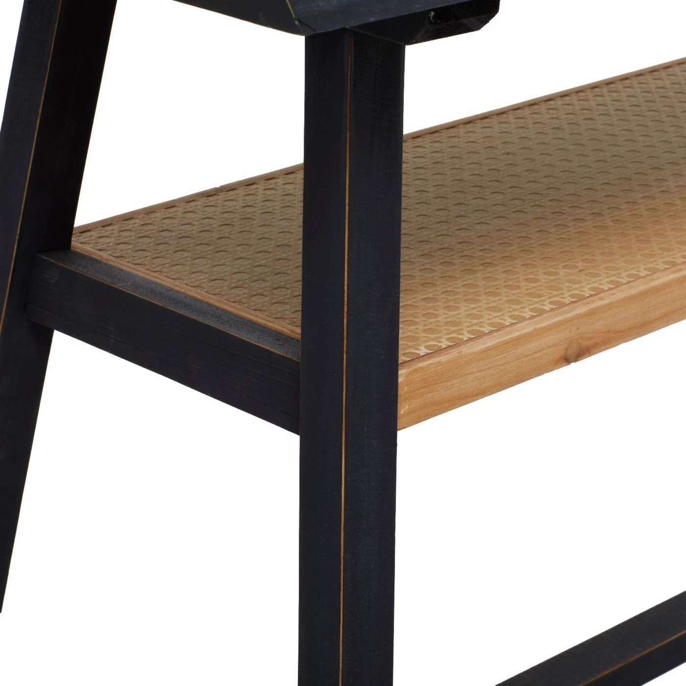 - Flared-edge wooden top and a rattan shelf