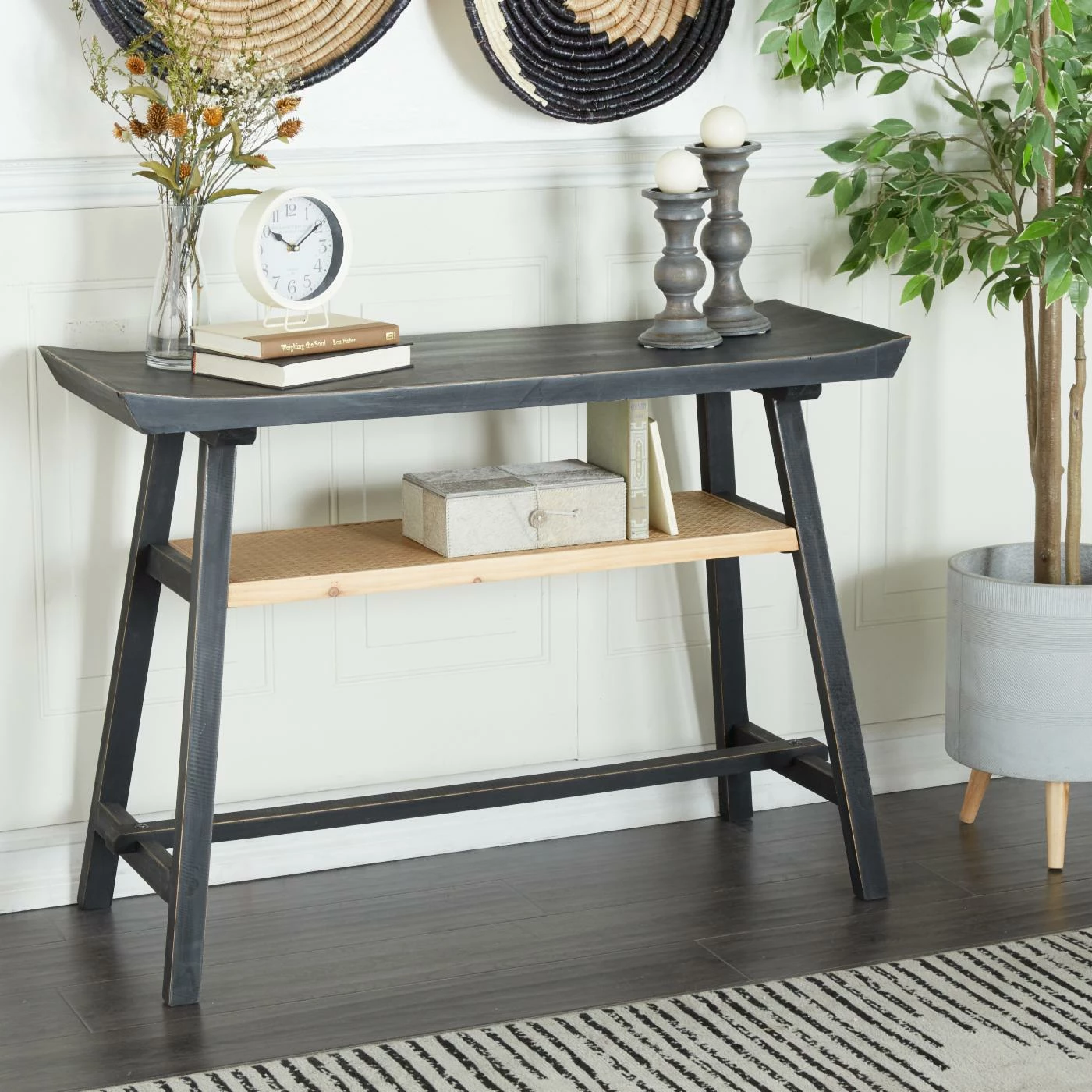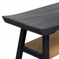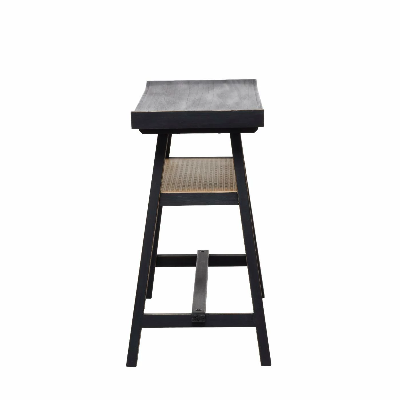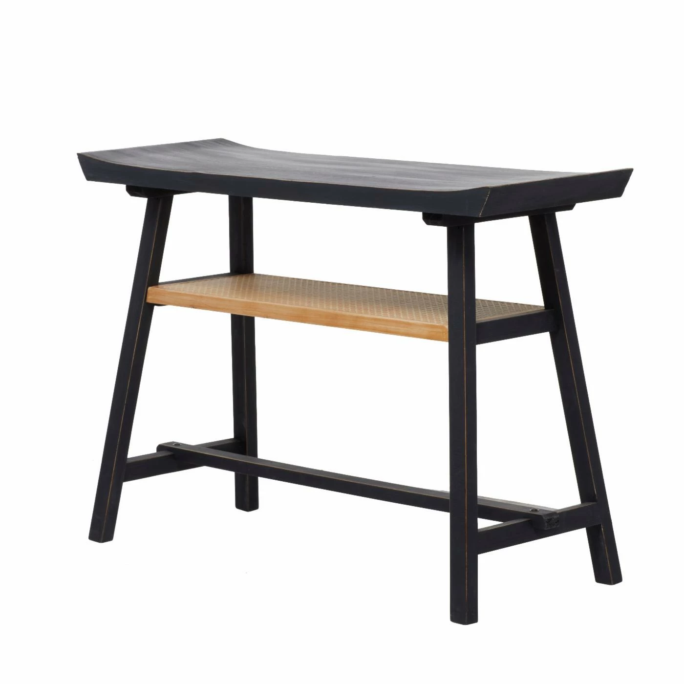 - Flared-edge wooden top and a rattan shelf