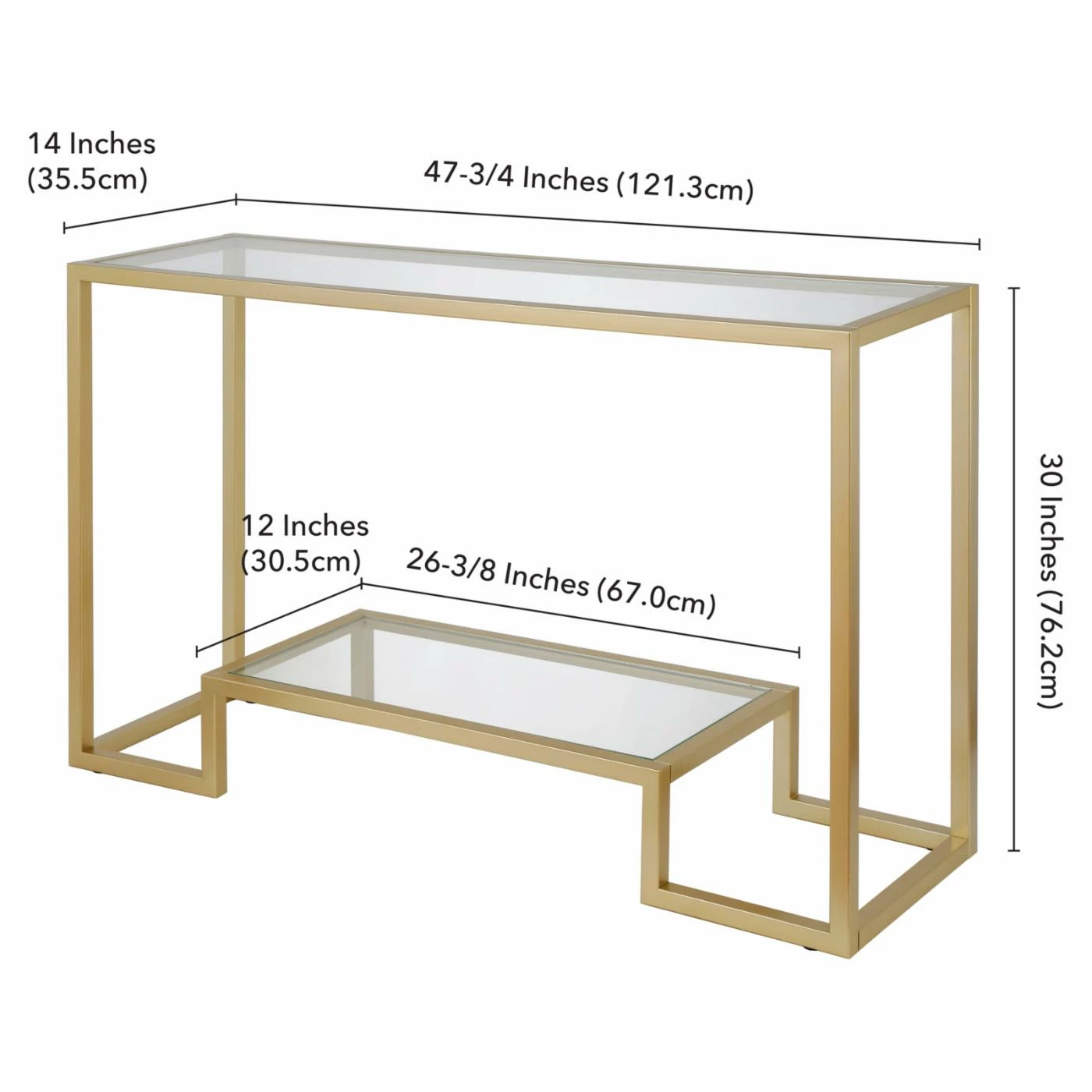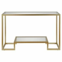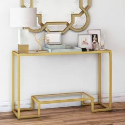 Clean up your living room’s design with some simple space for storage and display, thanks to the Hudson & Canal Athena Console Table. This elegant modern table has an expansive top that’s built from clear tempered glass. A raised, dais-like lower shelf provides a promontory for a featured decorative accent or a convenient storage bin. Squared steel constructs the frame, which is finished in a handsome brushed gold.