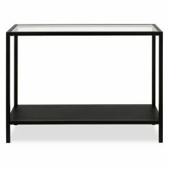 The Hudson & Canal Rigan Console Table is an exceptional contemporary addition to your new hallway, foyer, or living room, providing plentiful space for lamps, picture frames, vases, and more. The wide top is built from clear tempered glass with a matching metal shelf beneath for larger items. Squared metal constructs the frame, which is balanced on block legs. A sleek black finish tops the metal.