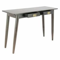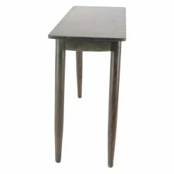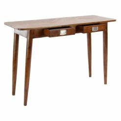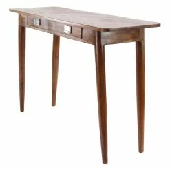 The DecMode Modern Kanaloa Wood Stained Brown Console Table with Drawers is supported by angled, tapered legs for mid-century modern style. It boasts solid wood craftsmanship, recessed drawer pulls, and it’s offered in your choice of available finish. Two drawers give you convenient storage space for household items.