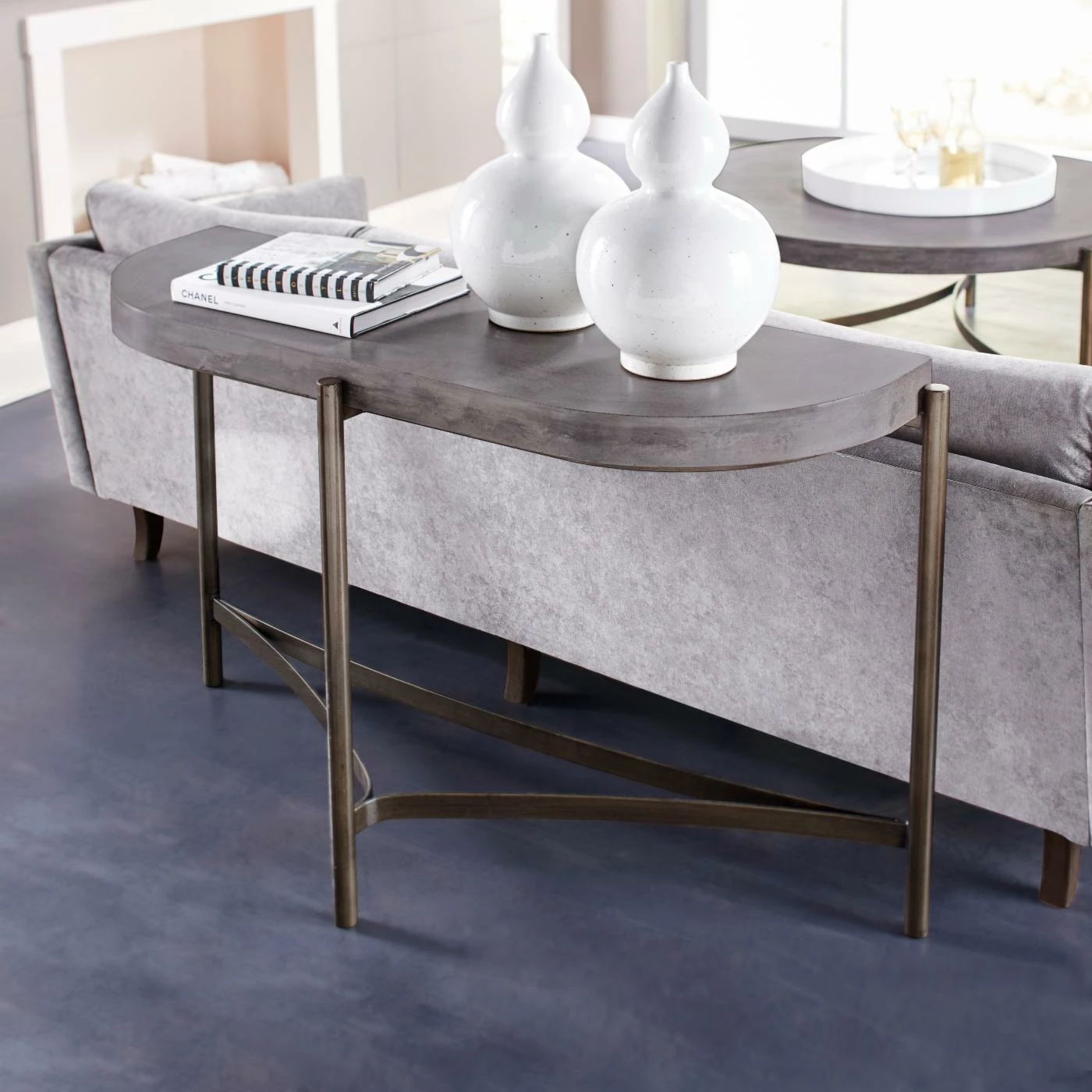 The dramatically shaped Modus Lyon Semi-Circular Console Table works beautifully in your entryway, hall, or behind the sofa. The demilune-shaped top of this console table made of fiber-reinforced concrete. Its one-piece base is crafted with tubular steel legs welded to curved solid steel stretchers and finished in a powder-coated brushed bronze.