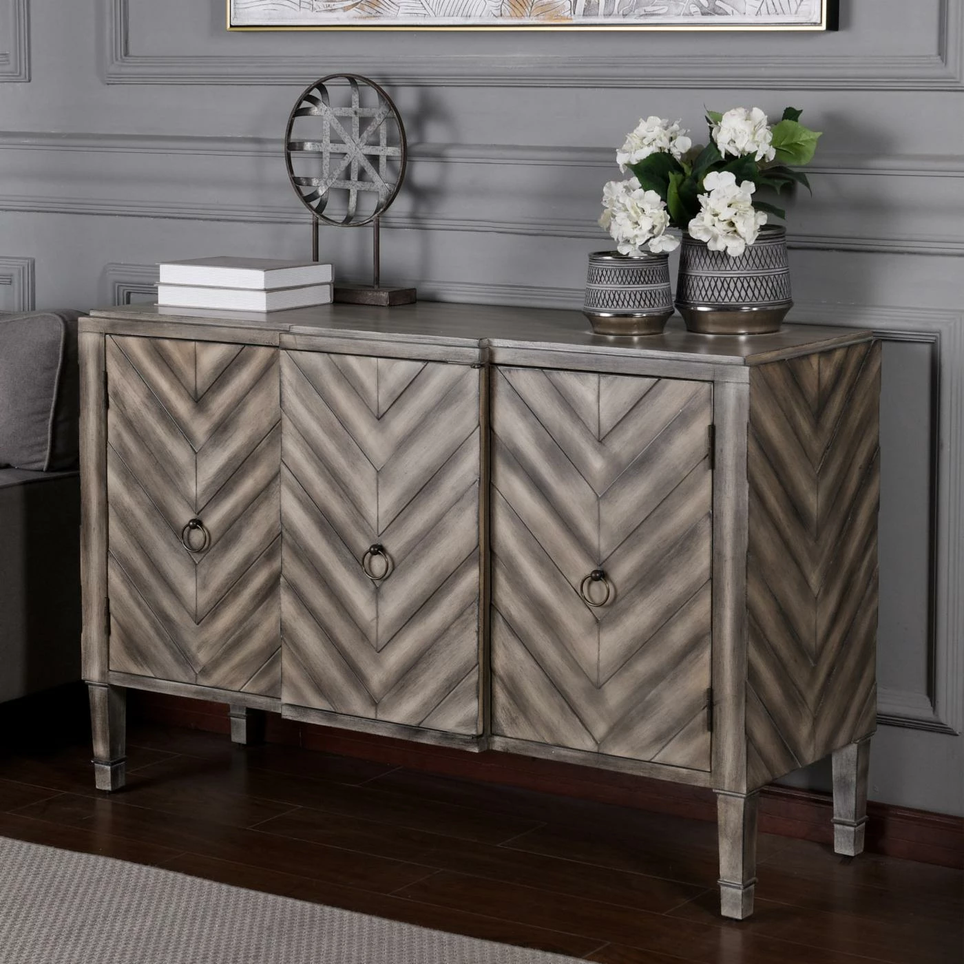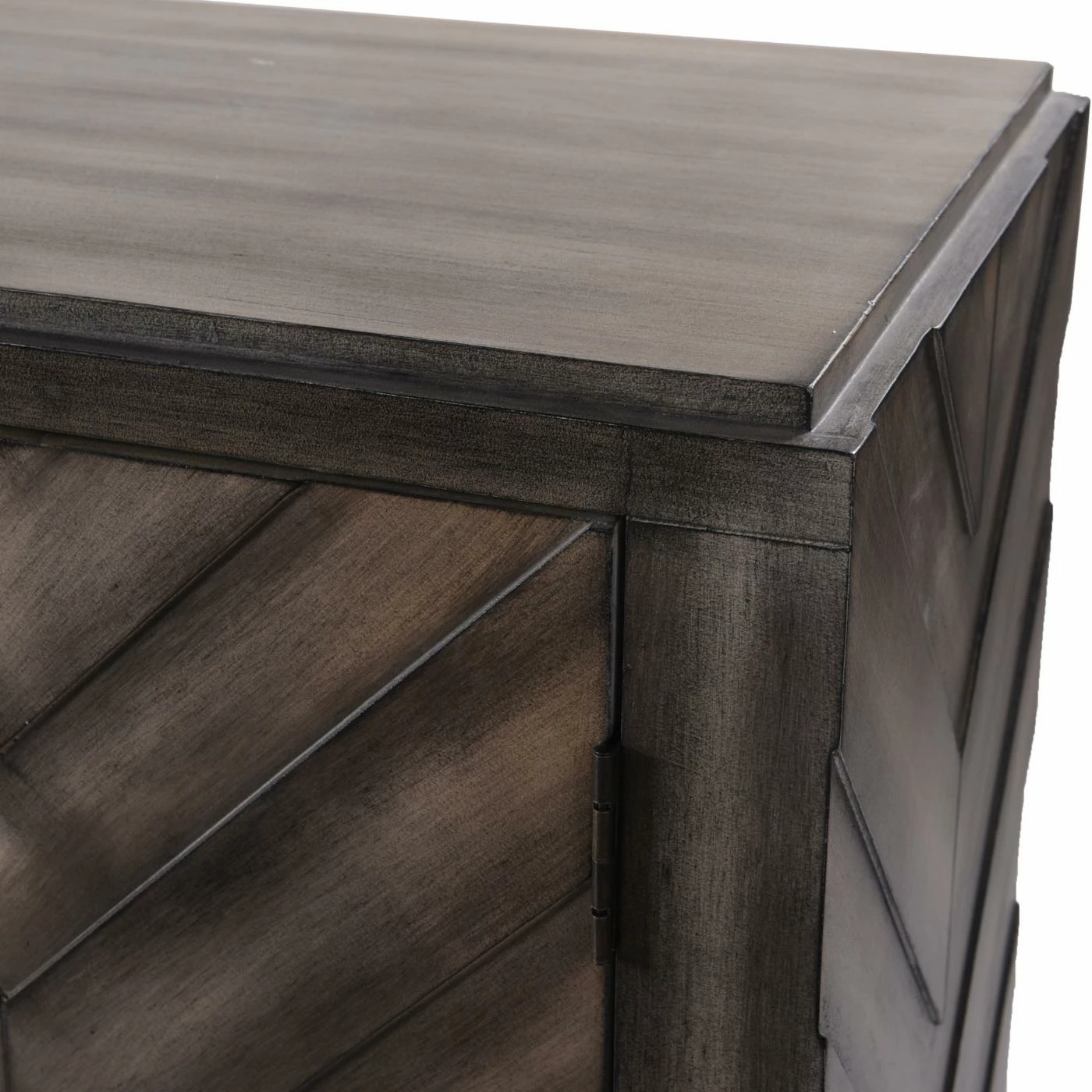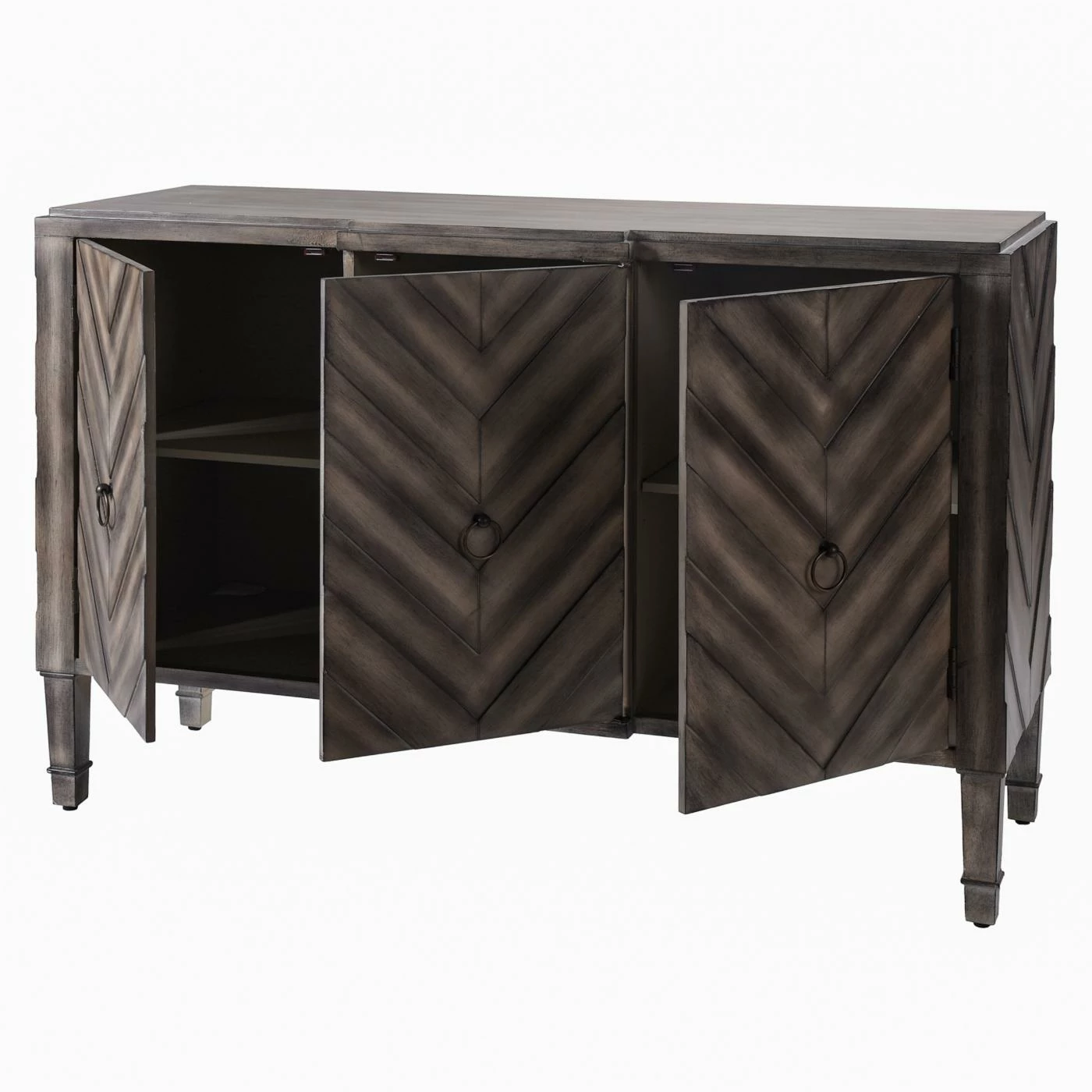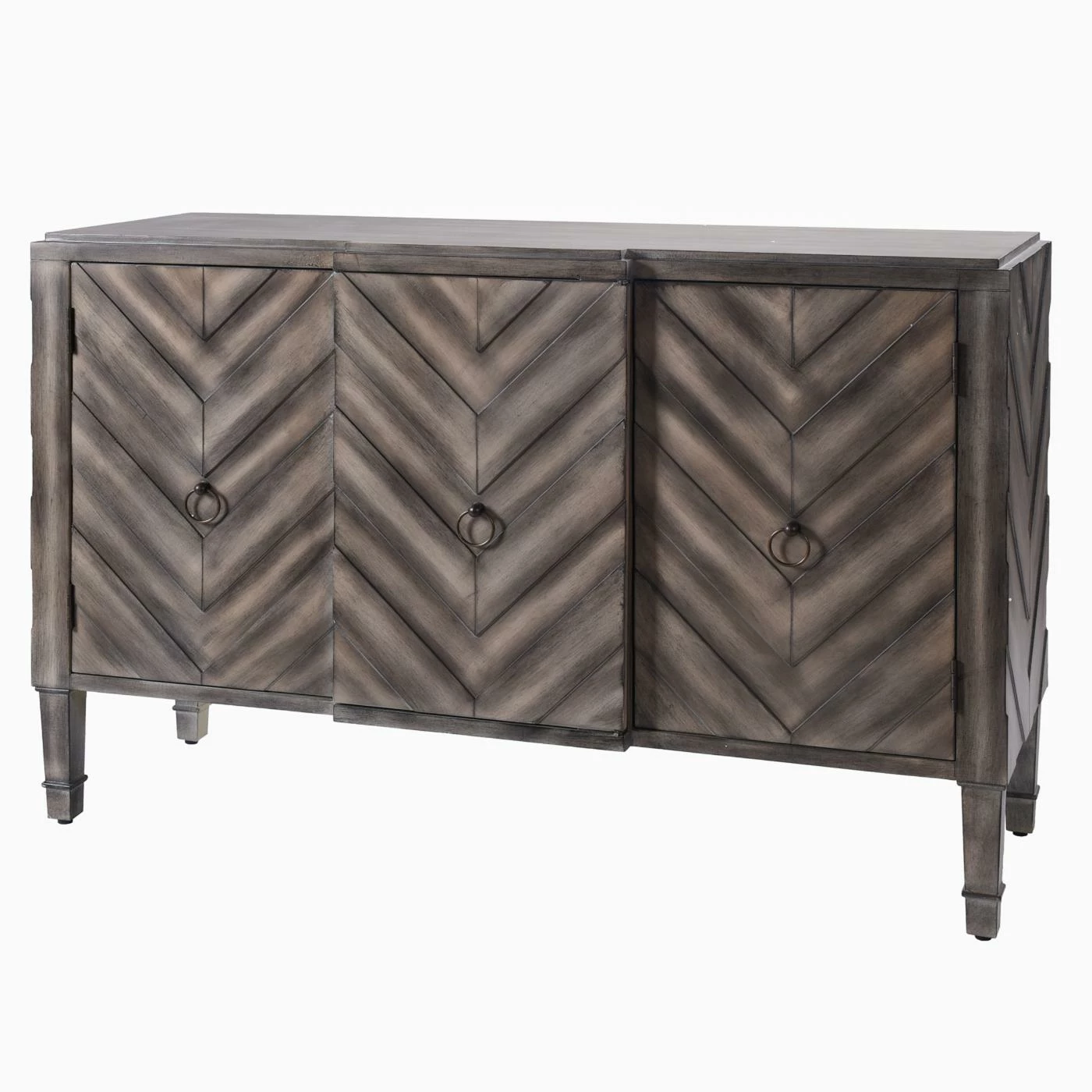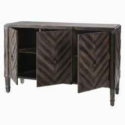 From its striking chevron pattern to its cool slate gray finish, the StyleCraft Chevron Patterned 3 Door Reclaimed Wood Console will steal the show in your space. Its three doors open to excellent storage, allowing you to stow odds and ends, books, and more. This console features a reclaimed wood construction that’s built to be reliably durable. The doors are equipped with metal hardware for a chic finishing touch.