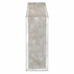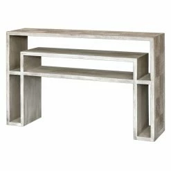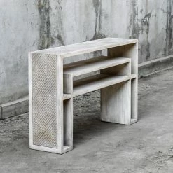 Sharp lines and a thick, bold frame make the Uttermost Genara Carved Console Table a wonderful complement to any contemporary living room. The spacious top is complemented by a raised lower shelf and side compartments that build on the angular, minimalist look. Thick mahogany wood constructs the piece, topped by an aged bone white finish. A warm oatmeal wash adds some additional color to the design.
