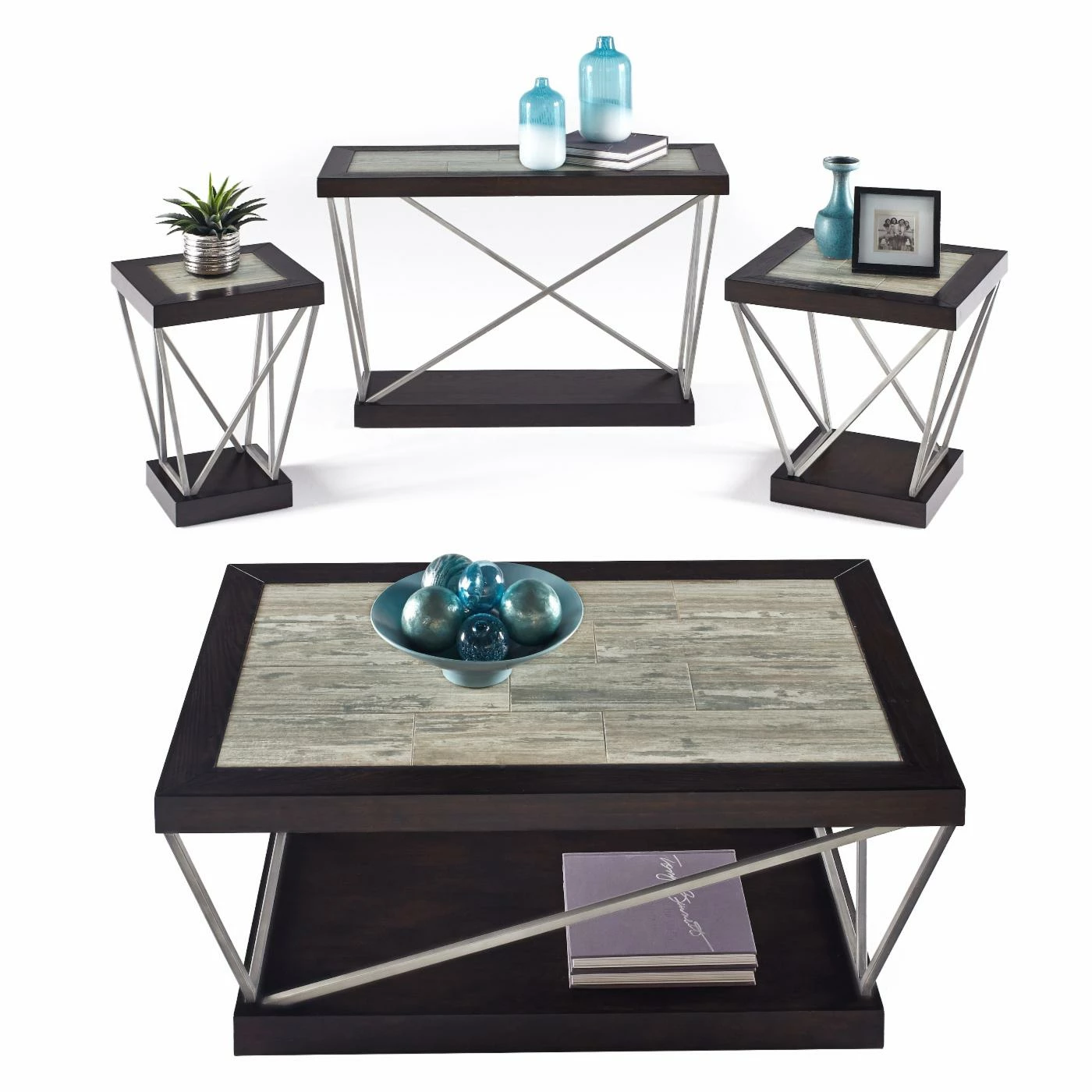 A chic complement to the living or dining room, the Progressive East Bay Sofa/Console Table sports distinctive ceramic tile inlays in a marvelous white, gray, and tan mosaic framed in solid black poplar. This generous surface is excellent for displaying books, photos, and collectibles, but it can also be used to serve food and drinks at a party. It is supported by angular metal legs and its thick black base also serves as an open shelf for baskets, bins, and dΓ©cor.