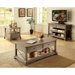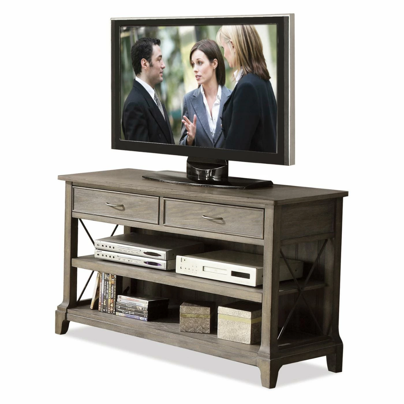 The stylish look and convenient features of the Riverside Windhaven Console Table – Shenandoah Barnwood make it the perfect piece to finish off your home. Just right for your television, two drawers provide convenient storage, while an open shelf below is perfect for components and media. The Shenandoah barnwood finish makes a chic addition, while the turned legs provide elegance. Assembly required.
