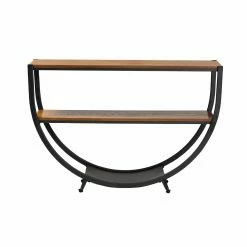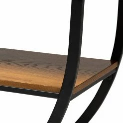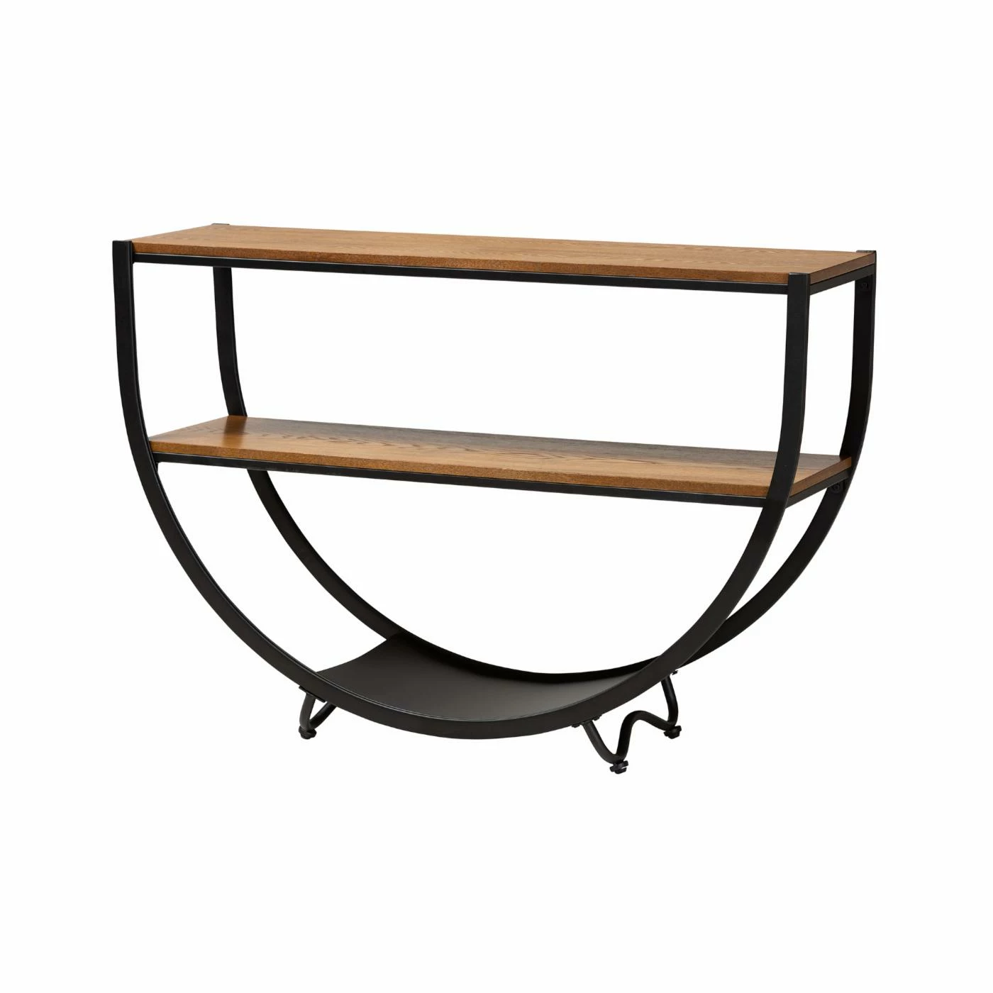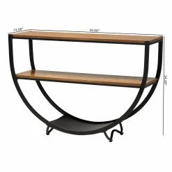 With its sweeping blackened metal frame, the Baxton Studio Blakes Rustic Industrial Console Table adds drama to industrial rustic spaces. You can arrange decorative accents along the veneered-engineered wood top and middle shelf. A small black metal shelf is built into the base for additional storage possibilities.