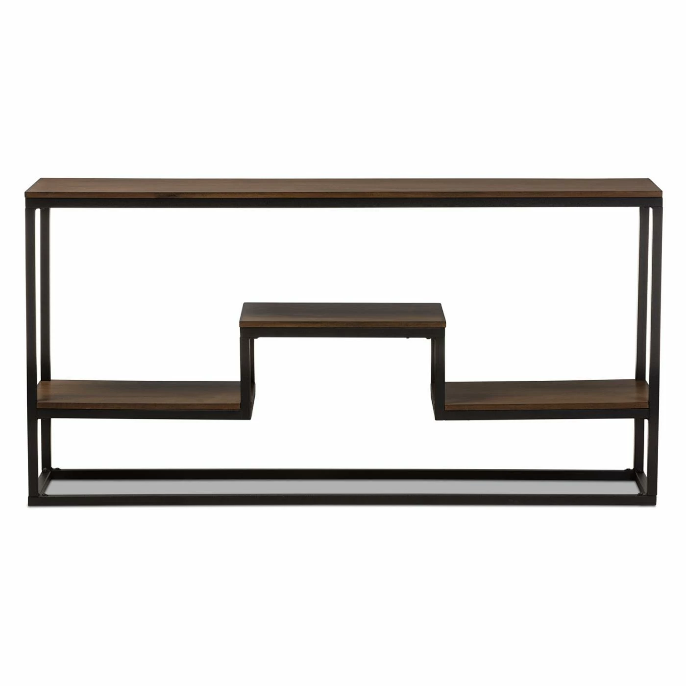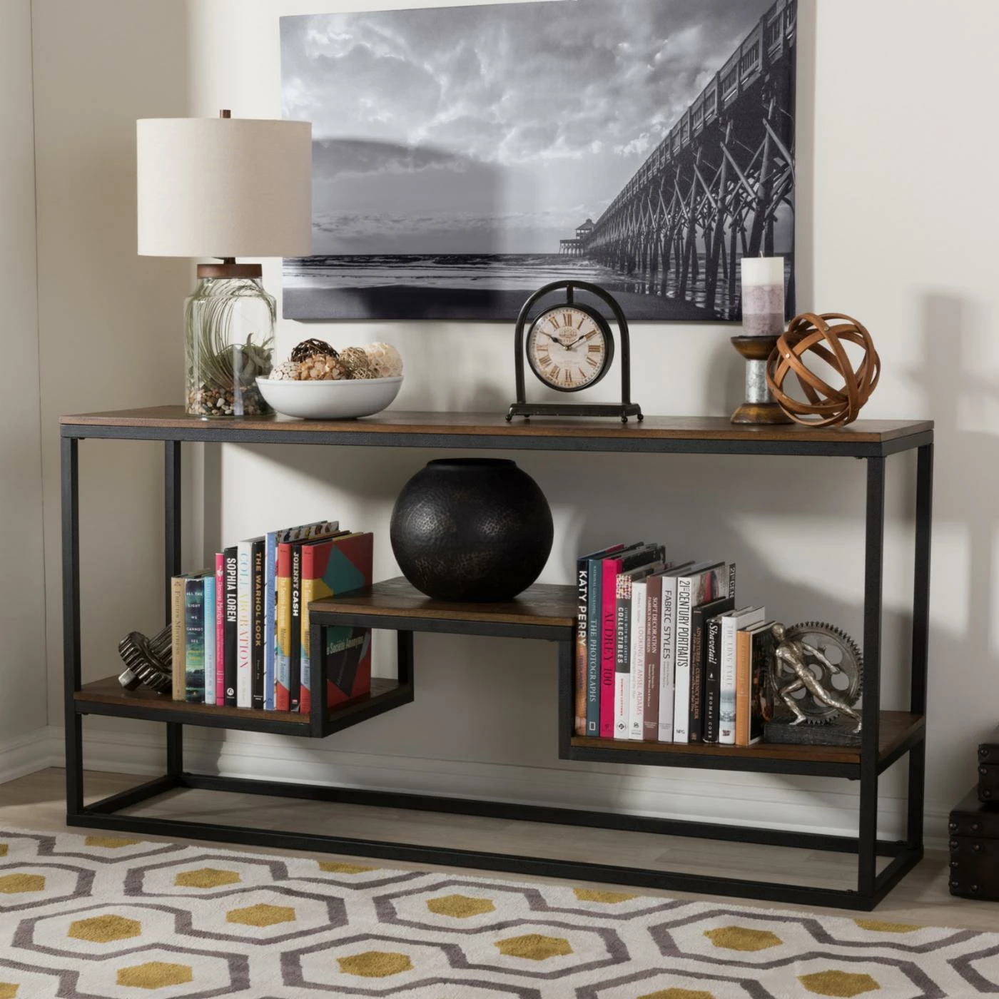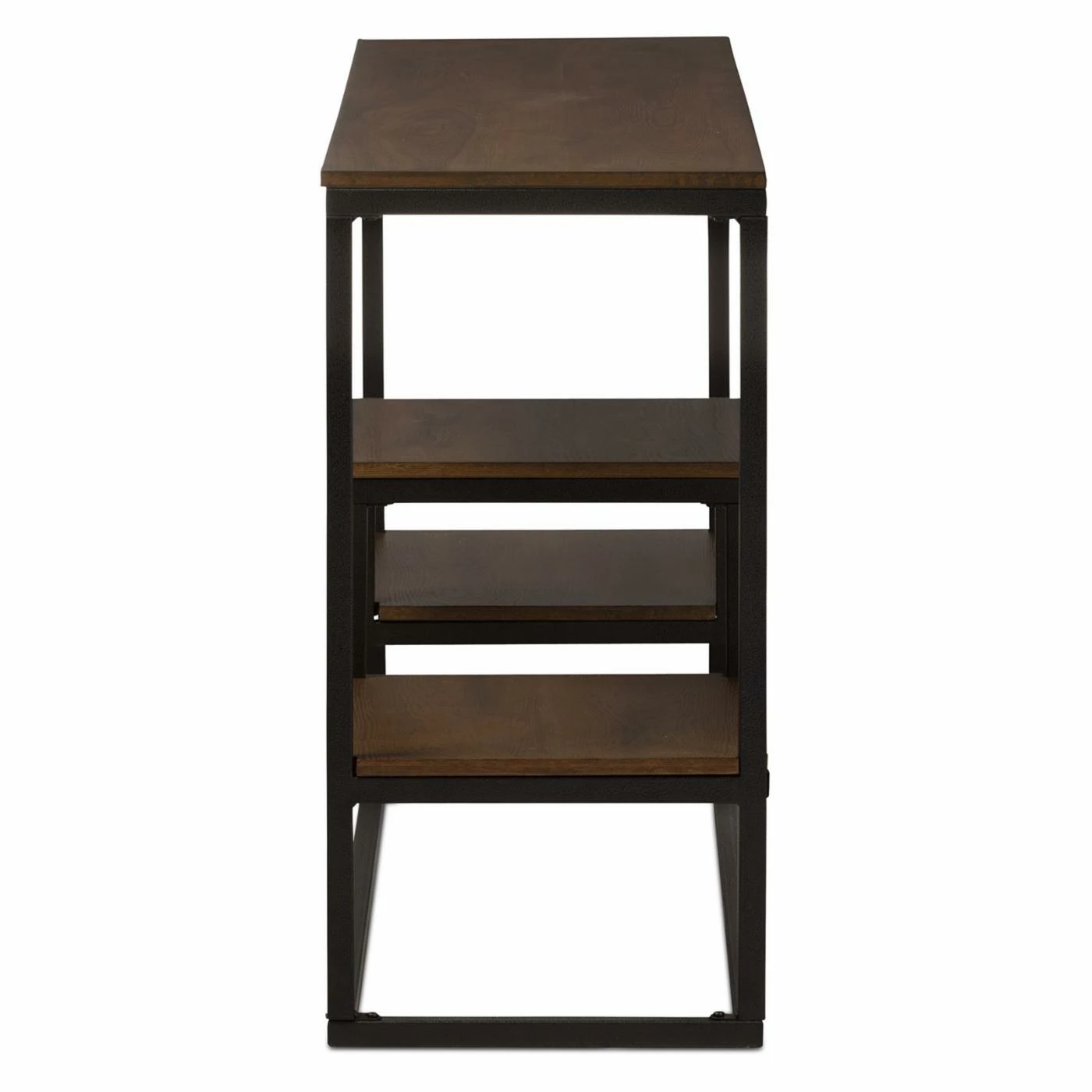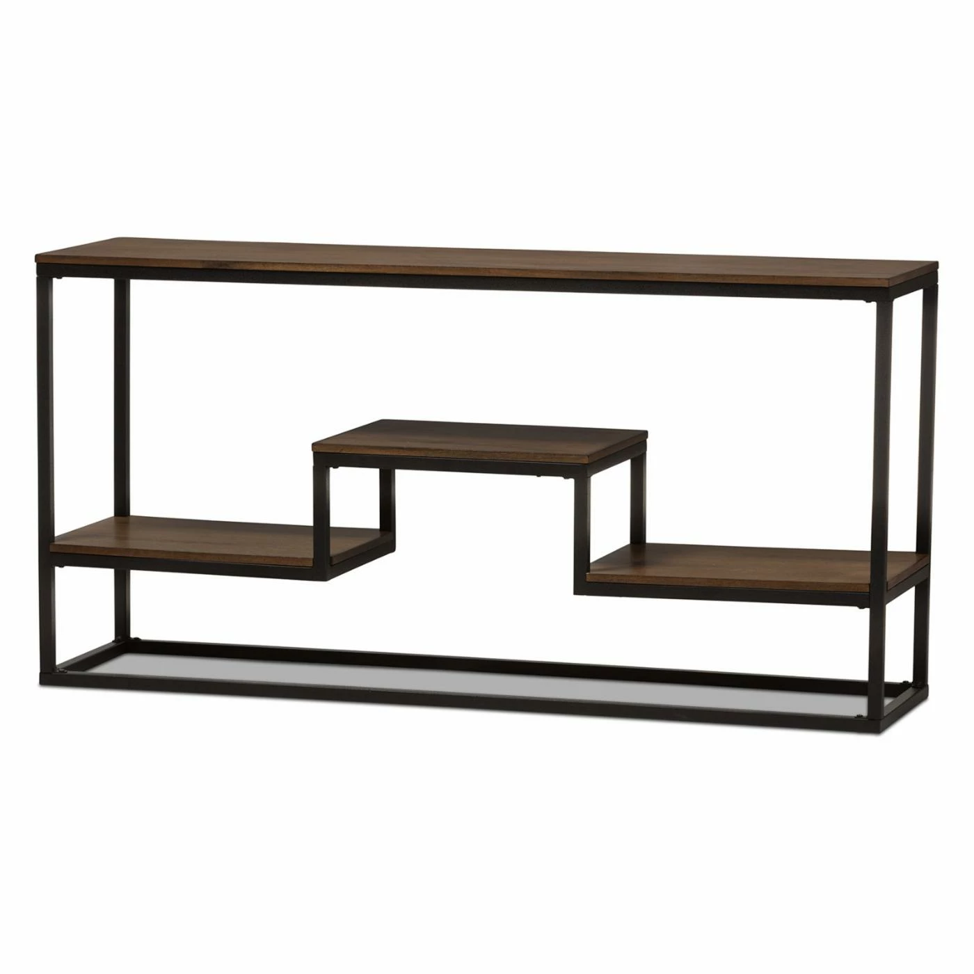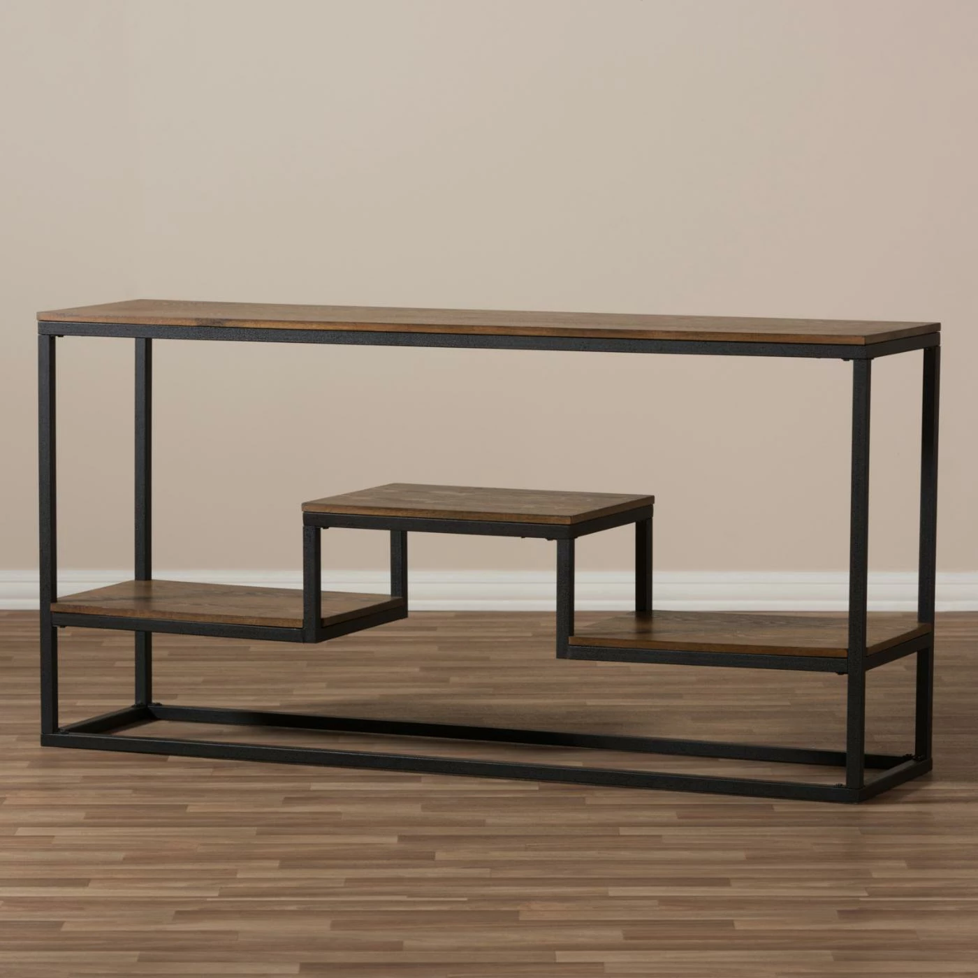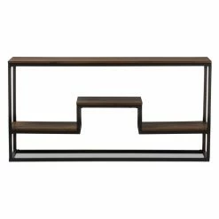 Arrange your favorite books, decorative accents, and souvenirs in one attractive area with the Baxton Studio Doreen Rustic Antique Black Textured Industrial Metal and Distressed Wood Console Table. This wide console table boasts a spacious top surface and a three tiered lower shelf area, allowing you to craft a tasteful display. The frame of the piece is crafted from robust metal in a textured antique black finish. Robust engineered wood is used to construct the tabletop and shelf tops. A rich distressed ash wood veneer overlays the wood for an appealing finishing touch.