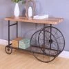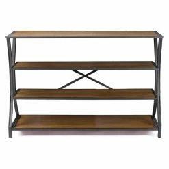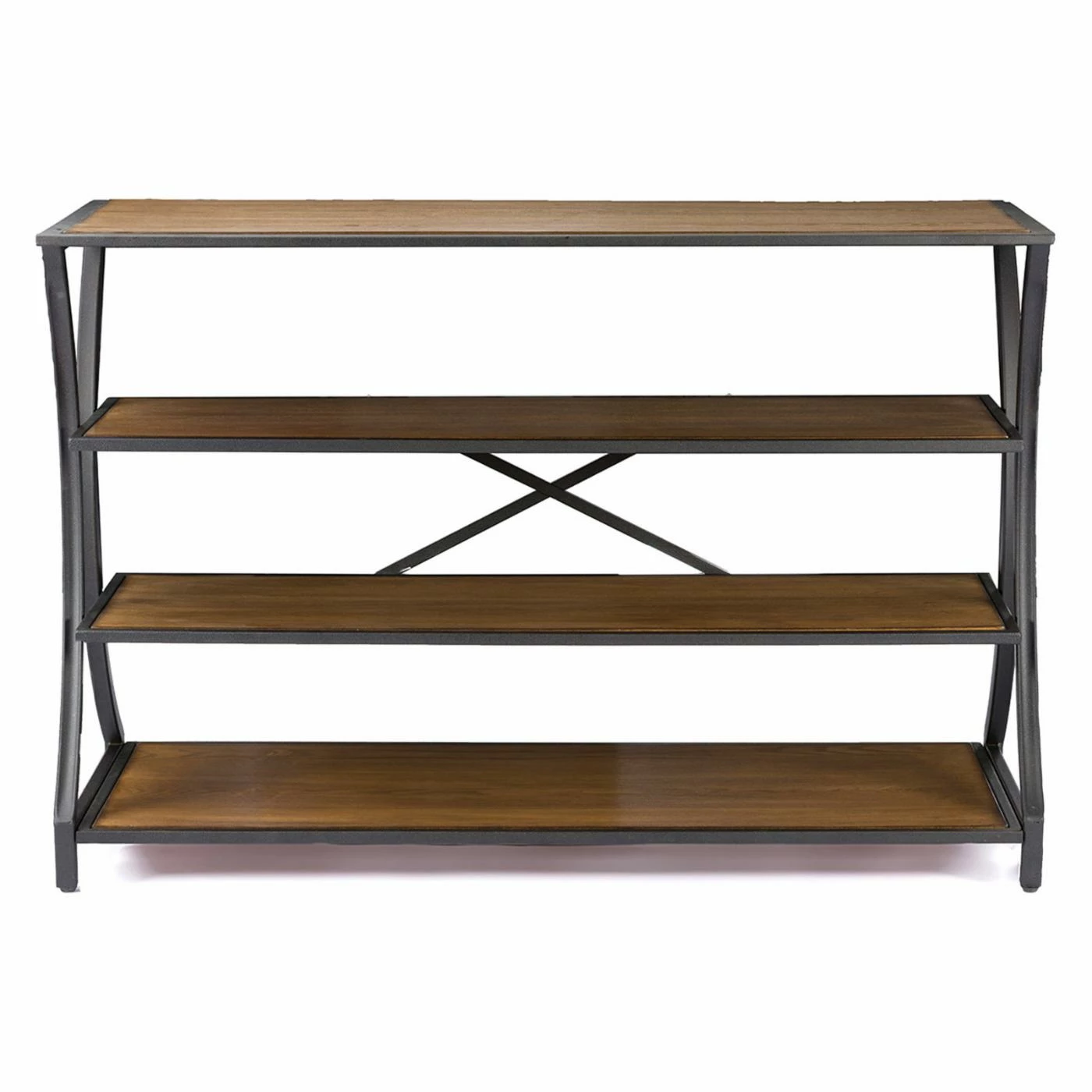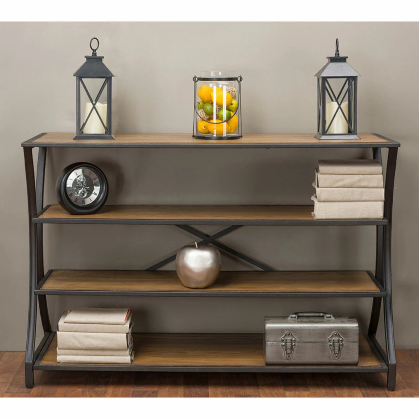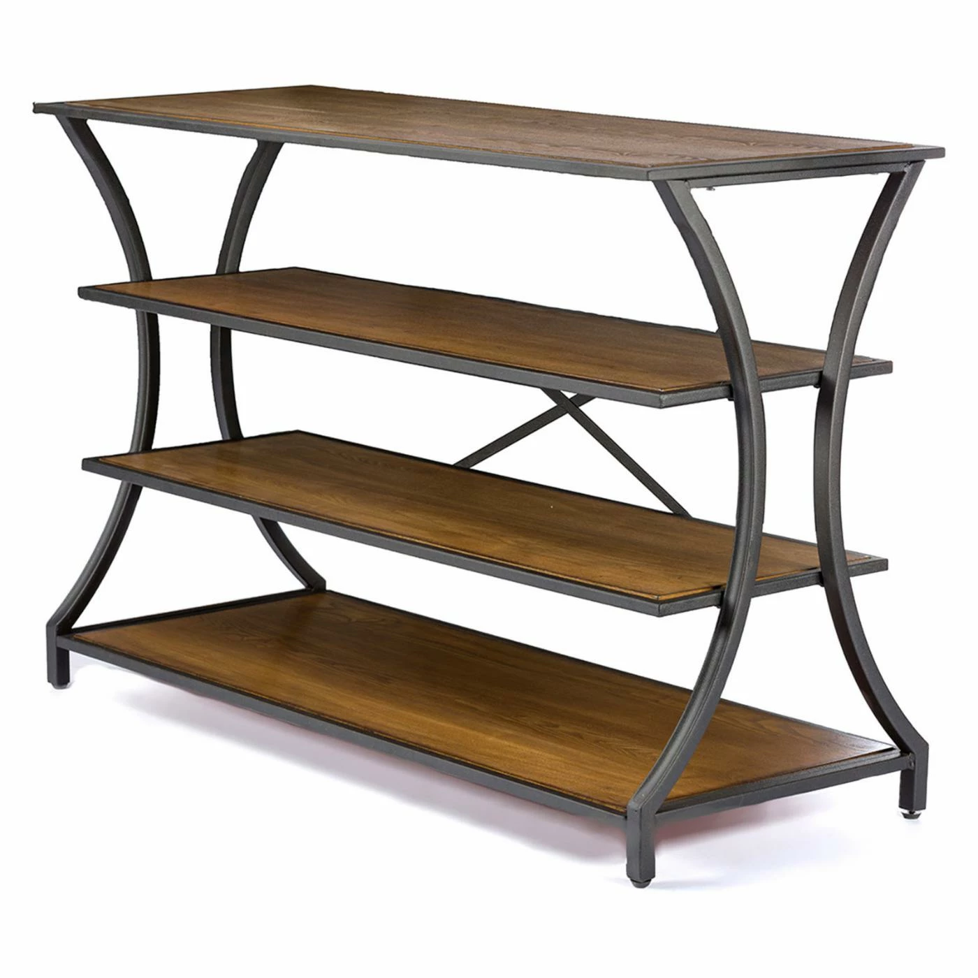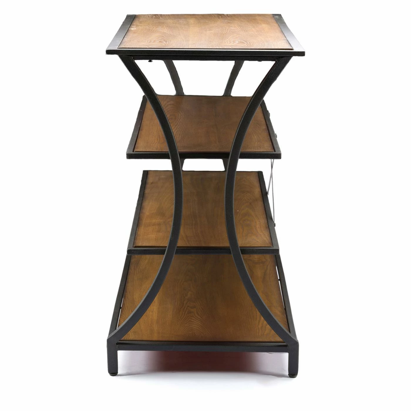 Display decorative accents or store cookware, games, and other essentials in industrial chic style with the Baxton Studio Lancashire Console Table. The table features a curvaceous iron frame with three, ash-veneered engineered wood shelves and a matching tabletop. To enhance the rustic vibe of the piece, the metal has a distressed bronze finish.