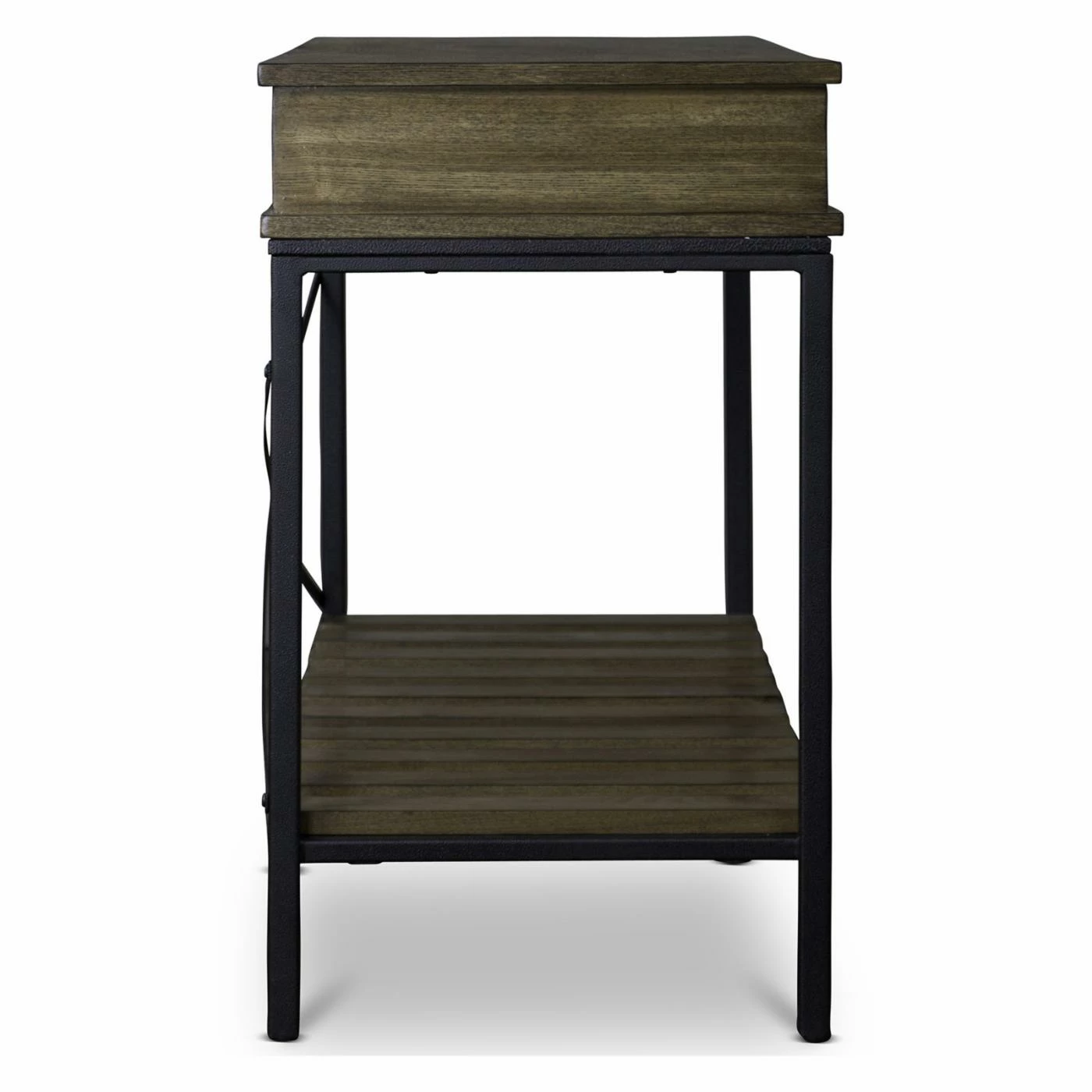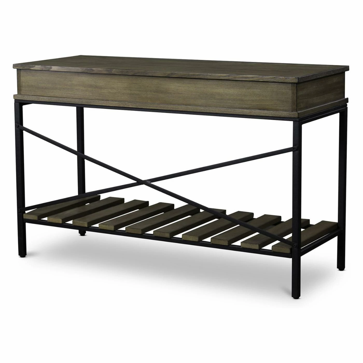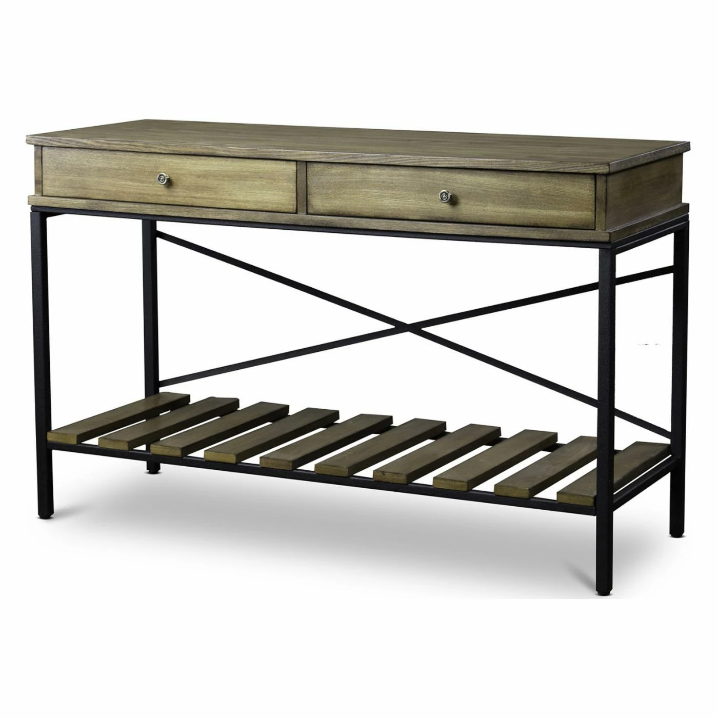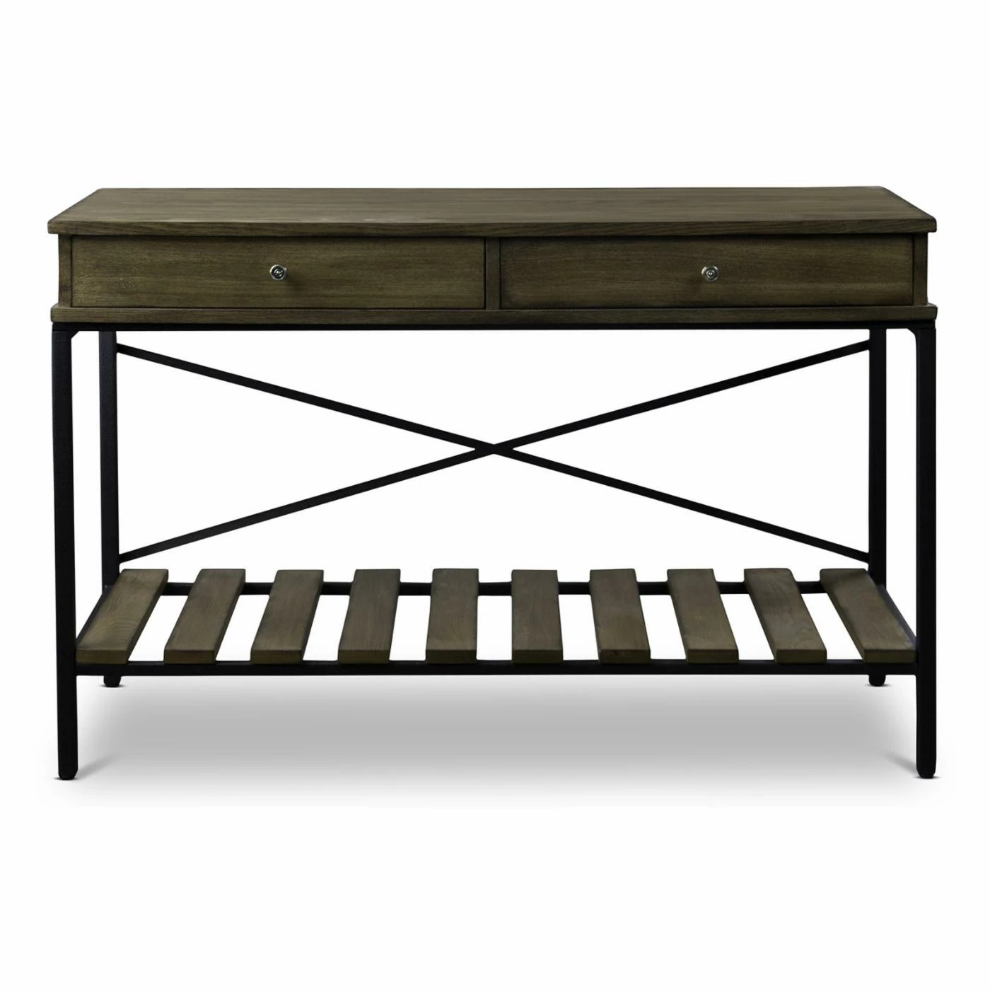 Designed to appear weathered by time, the Baxton Studio Newcastle Console Table brings antique industrial appeal to entryways, hallways, and living spaces. The sturdy, engineered wood top rests on a heavy-duty black metal base and features two drawers for storing small items. You can display decorative accents on the slatted, engineered wood shelf below the tabletop.